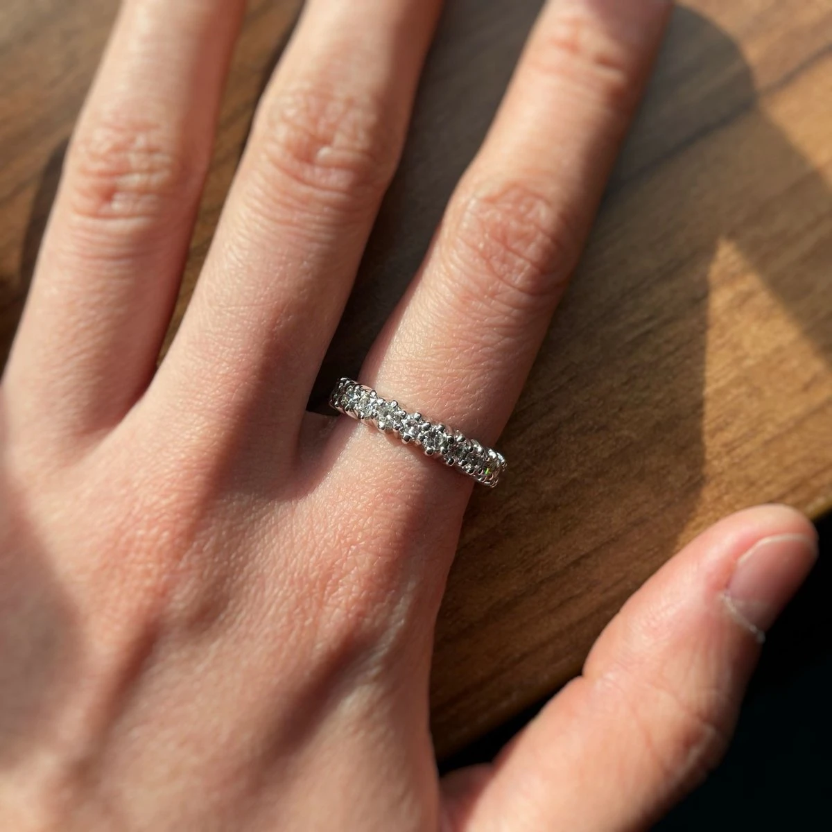 Alliance américaine en or blanc 750‰, sertie de 24 diamants demi-taille (1,40 carats environ), qualité G/VS.