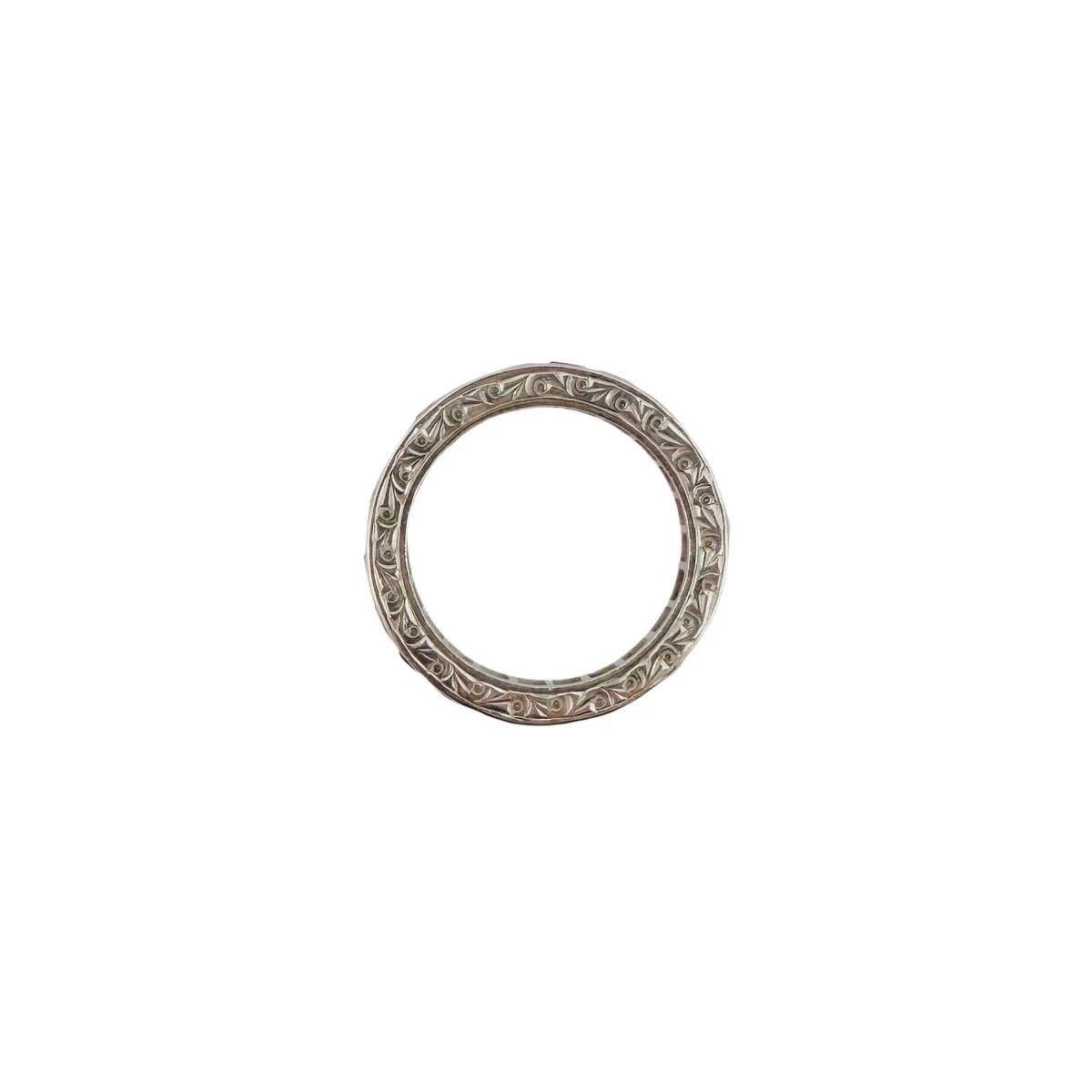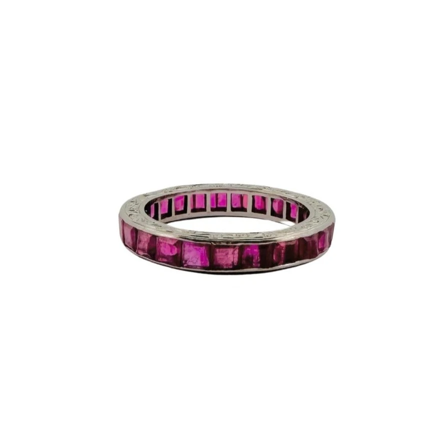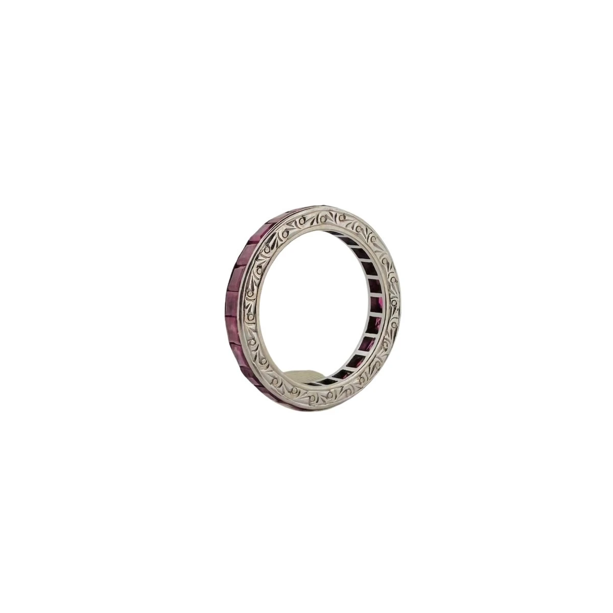 Alliance américaine en or blanc 18 carats et rubis calibrés. La monture à décor gravé. Petites égrisures sur les rubis.