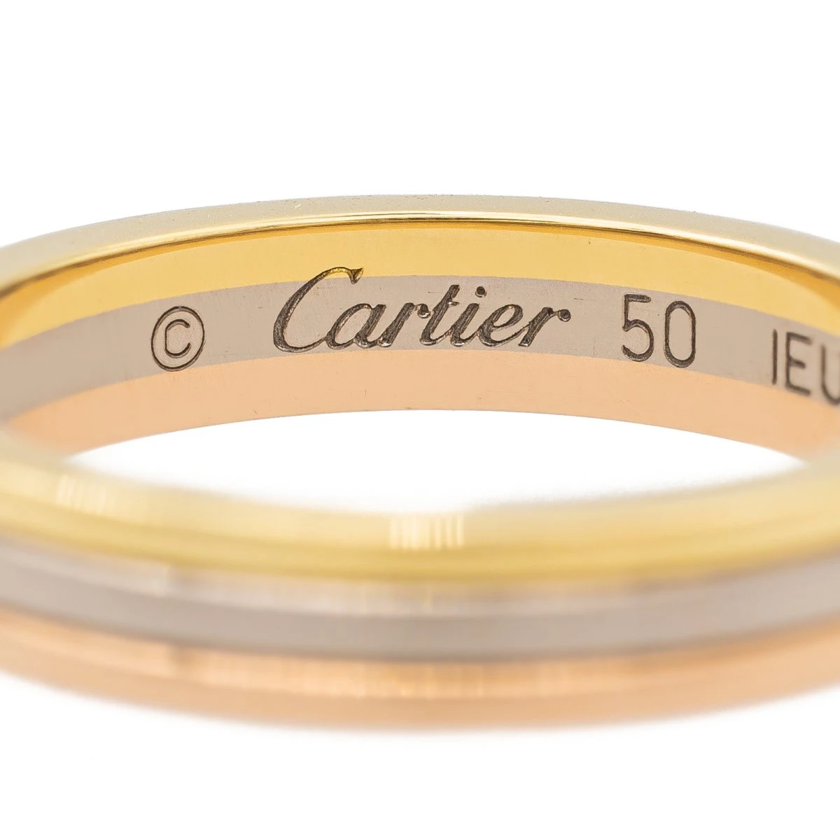 Alliance signée de la Maison Cartier en 3 ors 750 millièmes (18 carats). modèle Trinity. largeur sur le dessus : 0.35 cm. tour de doigt : 50. poids total : 4.55 g. poinçon Saint Bernard. vendue avec écrin et certificat d’origine. numérotée. excellent état