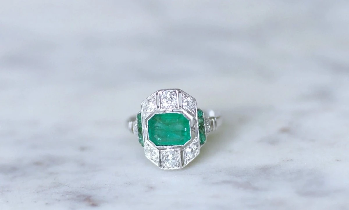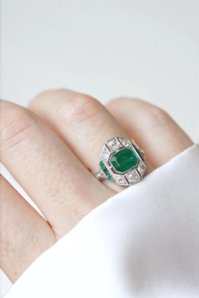 Bague géométrique en or blanc 18Kt (poinçon : aigle) sertie en son centre d’une émeraude rectangulaire à pans coupés pesant environ 1.30 Cts, dans un entourage de diamants taillés à l’ancienne, dont le poids total est estimé à environ 0.65 Ct, et d’émeraudes calibrées, dont le poids total est estimé à environ 0.15 Ct.