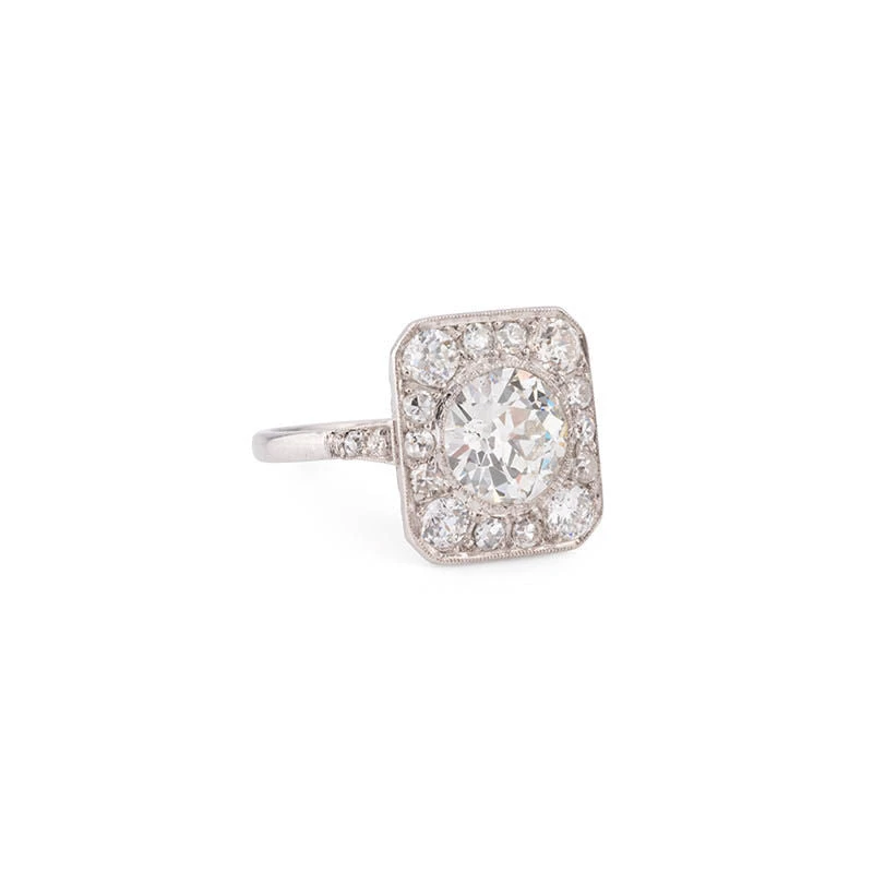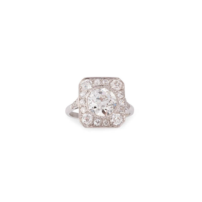 Bague d’époque Art Déco en Platine de forme légèrement rectangulaire sertie au centre d’un important diamant de 1.50 carats et d’un entourage diamants.