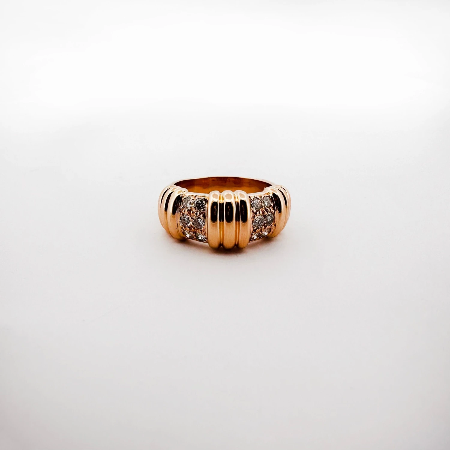 Bague bandeau en or jaune 18K (750/1000) ornée de trois motifs à godrons et de deux réserves de pavage diamanté.