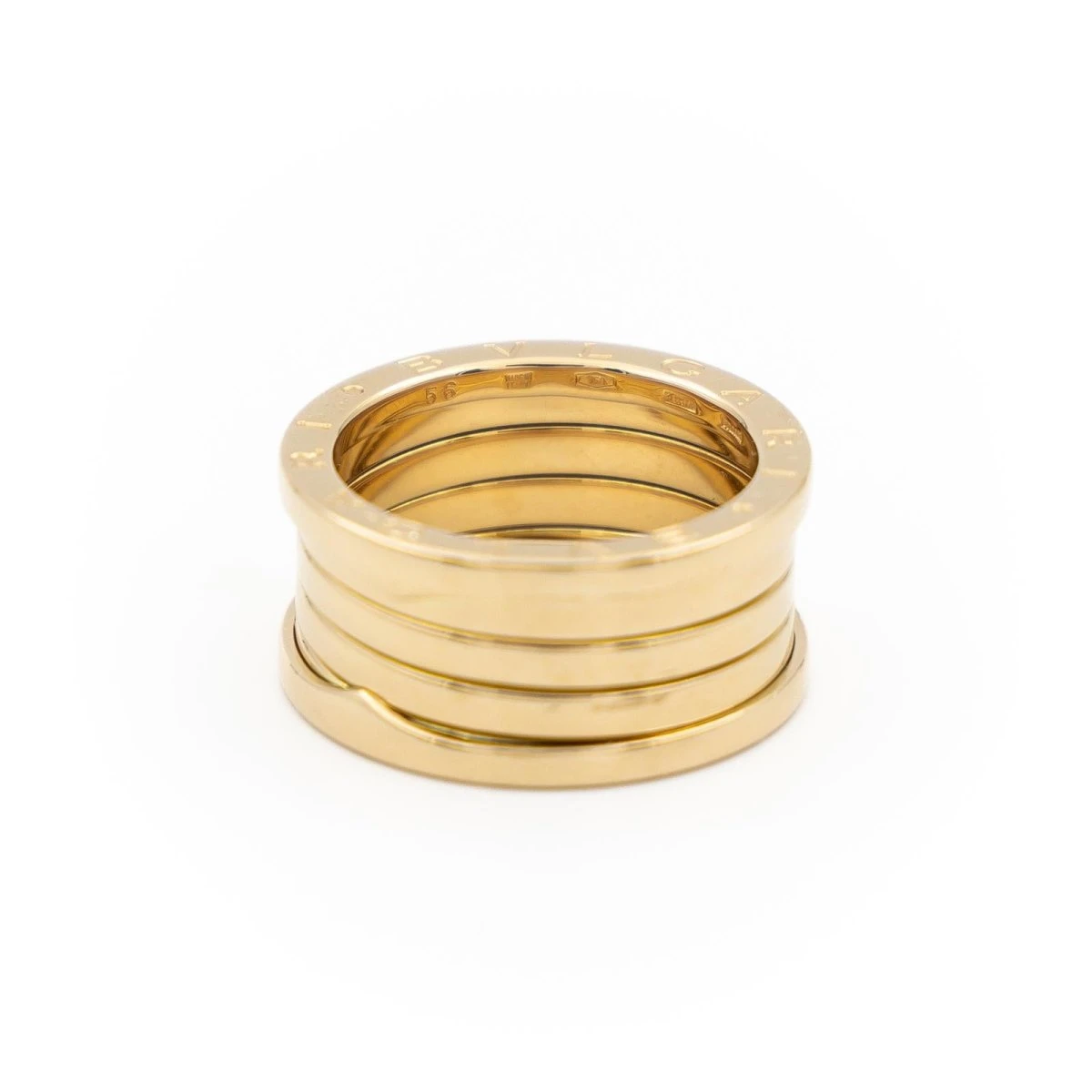 Bague signée de la maison Bulgari. collection B.Zéro1. modèle 4 rangs. en or jaune 750 millièmes (18 carats). tour de doigt: 56. largeur: 1.21 cm. signée er numérotée. poids total: 12.04 g. Prix neuf: 3000€. Excellent état