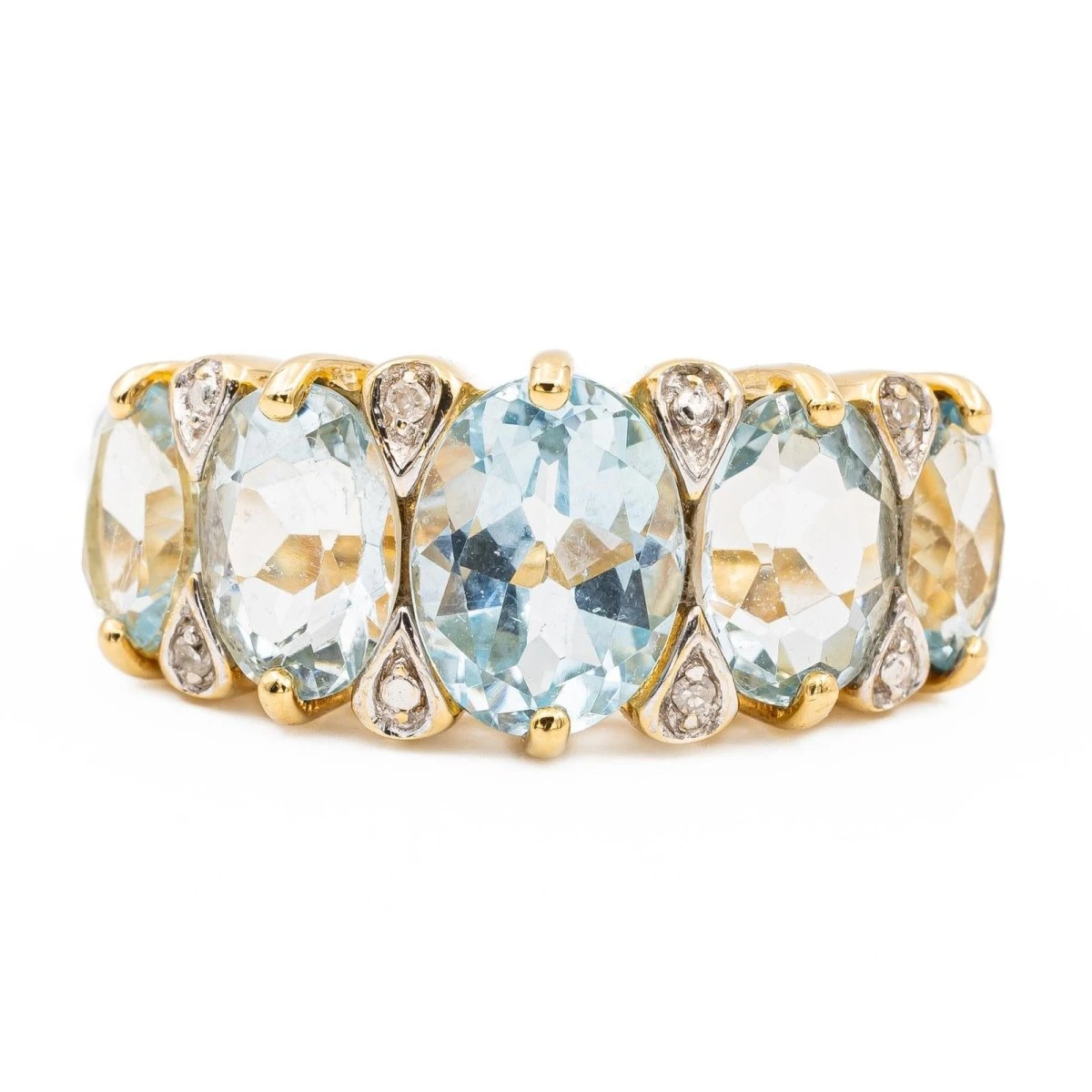 Bague bandeau sertie de topazes et de diamants. en or jaune 750 millièmes (18 carats). 5 topazes taille ovale. d’un poids total d’environ 3.1 ct. et de 4 diamants taille huit/huit. d’un poids total d’environ 0.02 ct. (chaque diamant d’un poids d’environ 0.005 ct). largeur sur le dessus: 0.89 cm. tour de doigt: 53. poids total: 4.63 g. poinçon tête d’aigle. excellent état