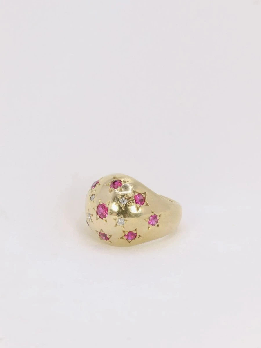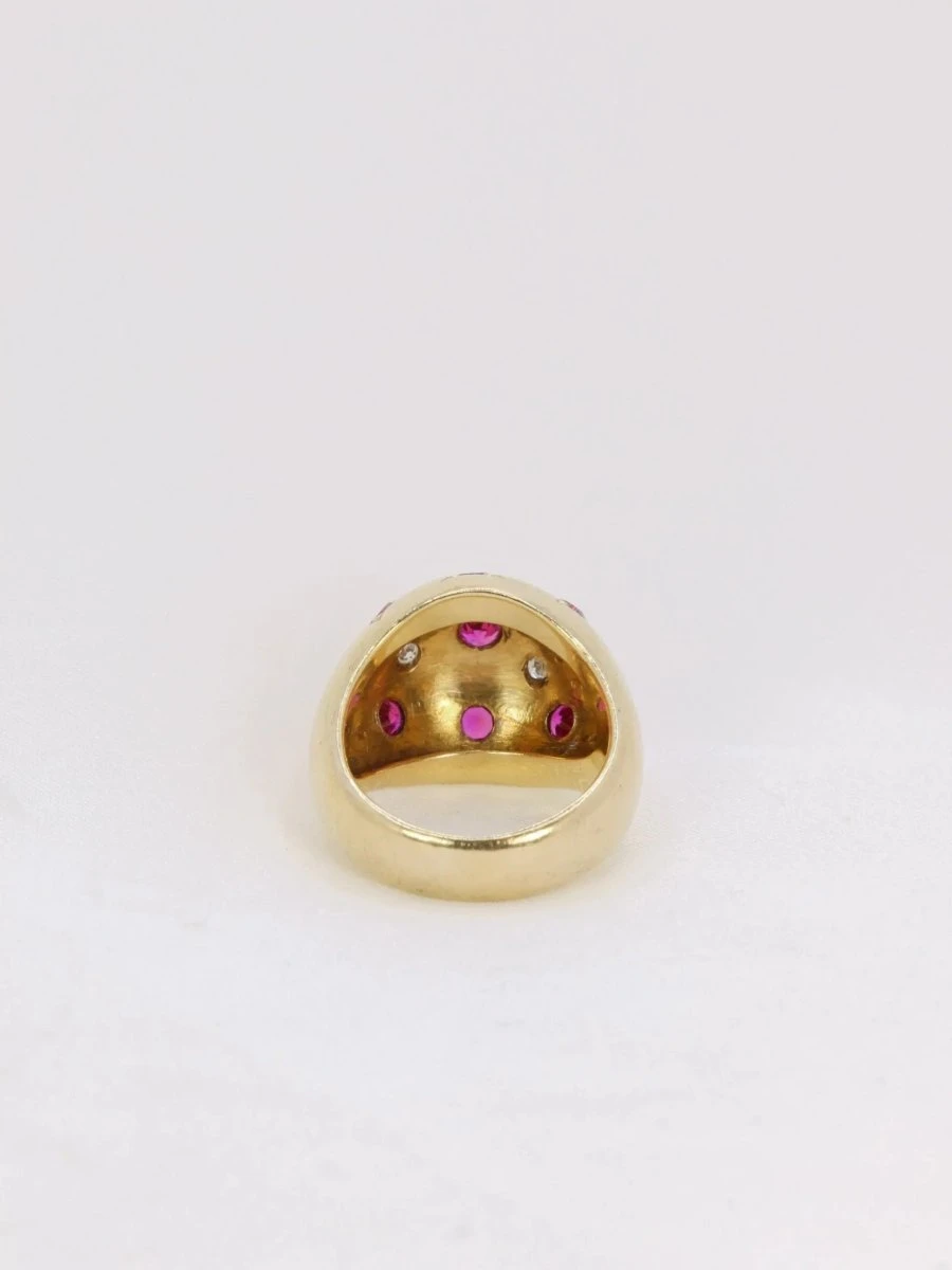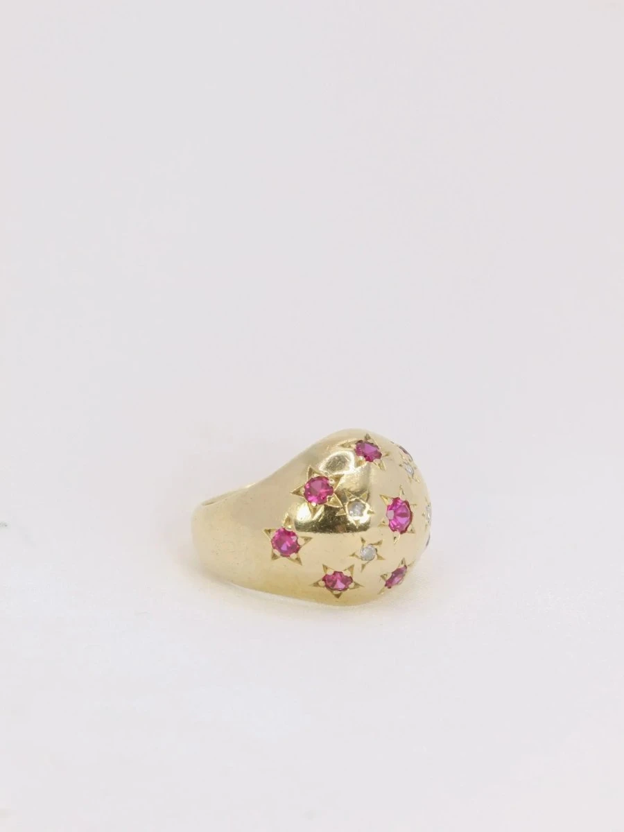 Bague boule en or jaune 18k (750°/°°) sertie de neuf rubis probablement synthétiques dont un central plus important et de quatre diamants taille rose. Travail des années 1960. A noter un infime manque sur l’un des diamants taillés en rose.
