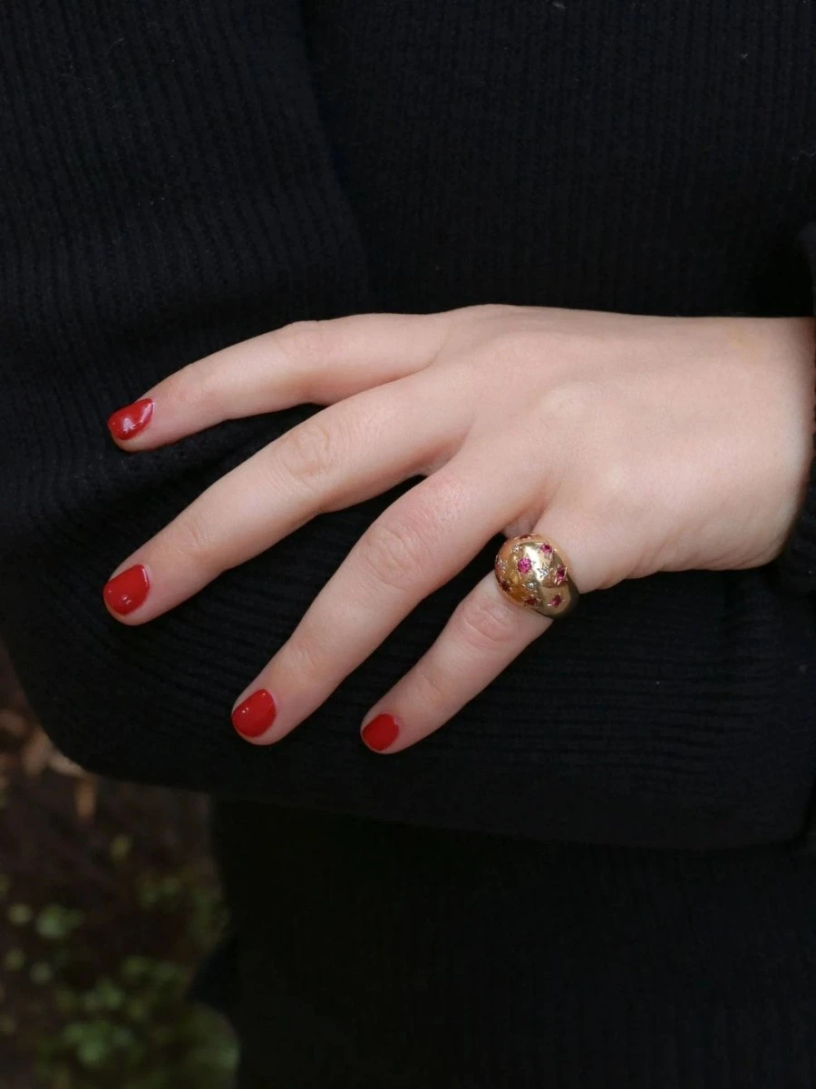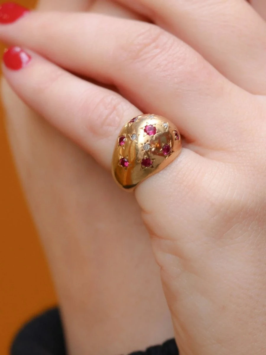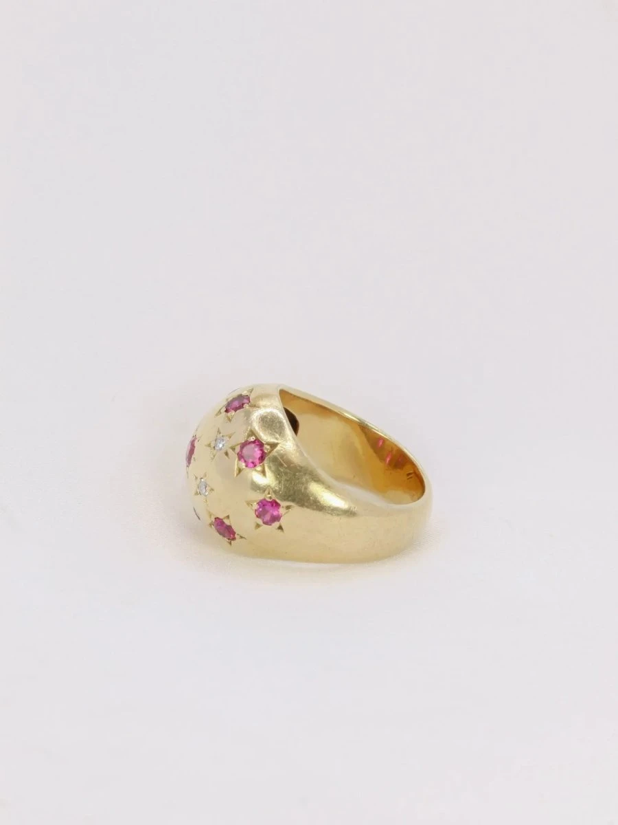 Bague boule en or jaune 18k (750°/°°) sertie de neuf rubis probablement synthétiques dont un central plus important et de quatre diamants taille rose. Travail des années 1960. A noter un infime manque sur l’un des diamants taillés en rose.