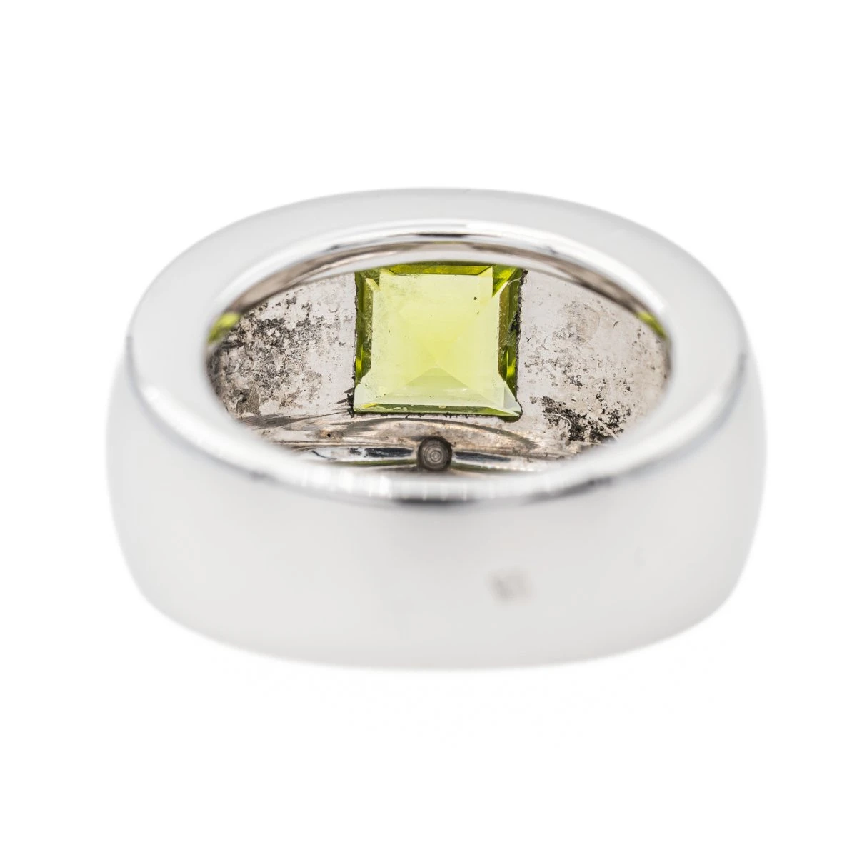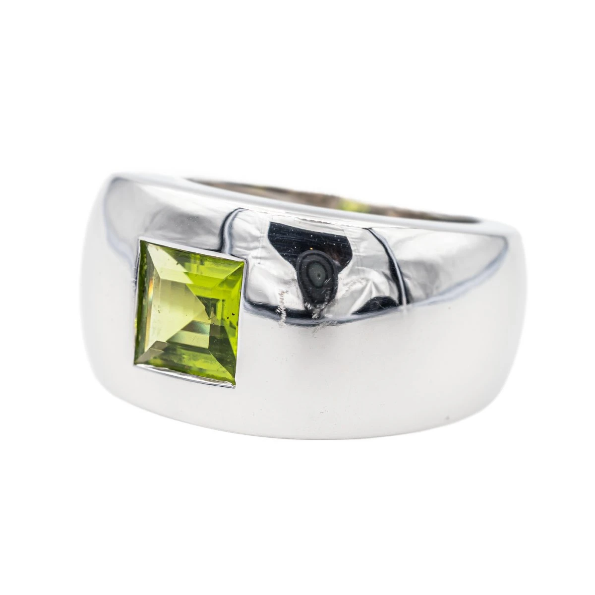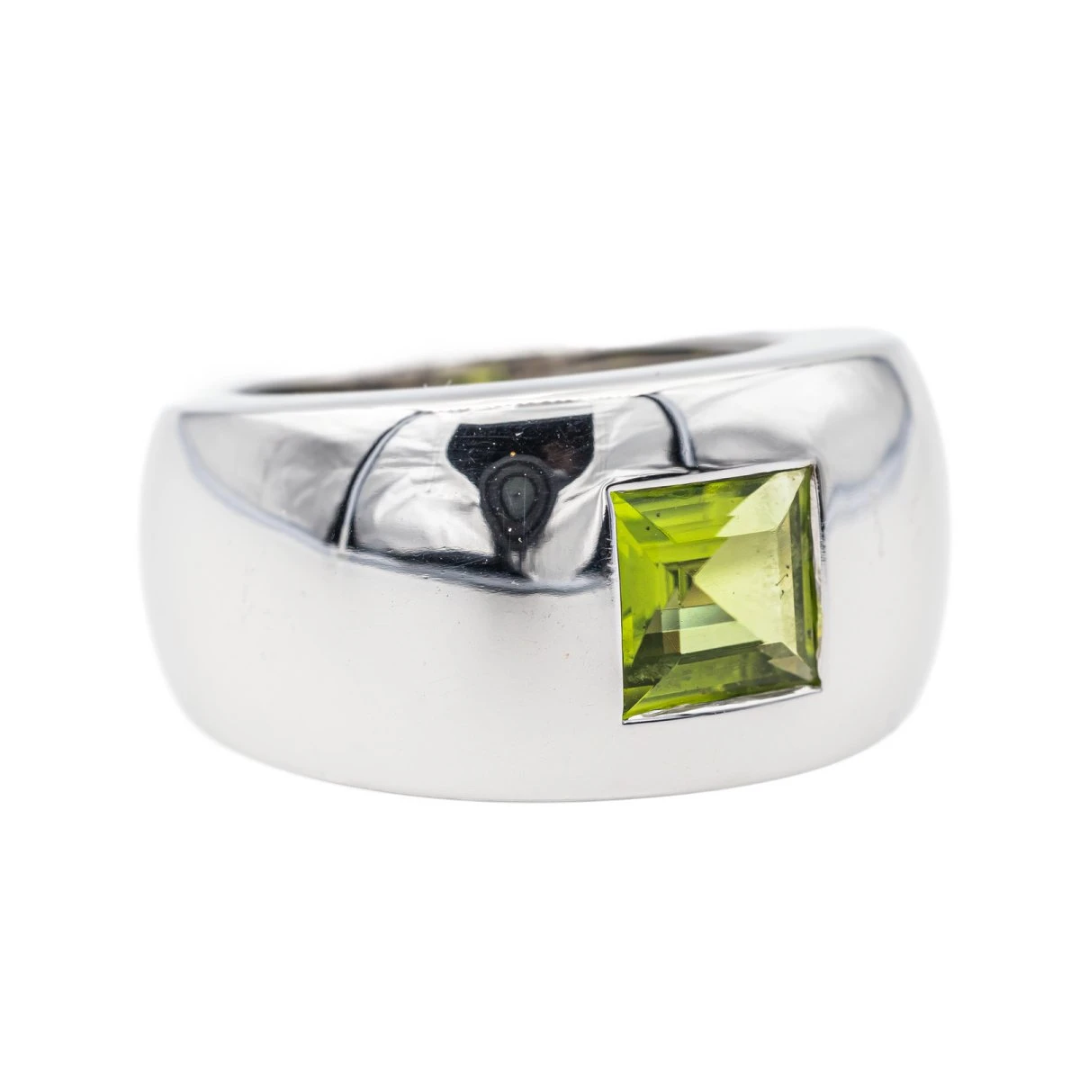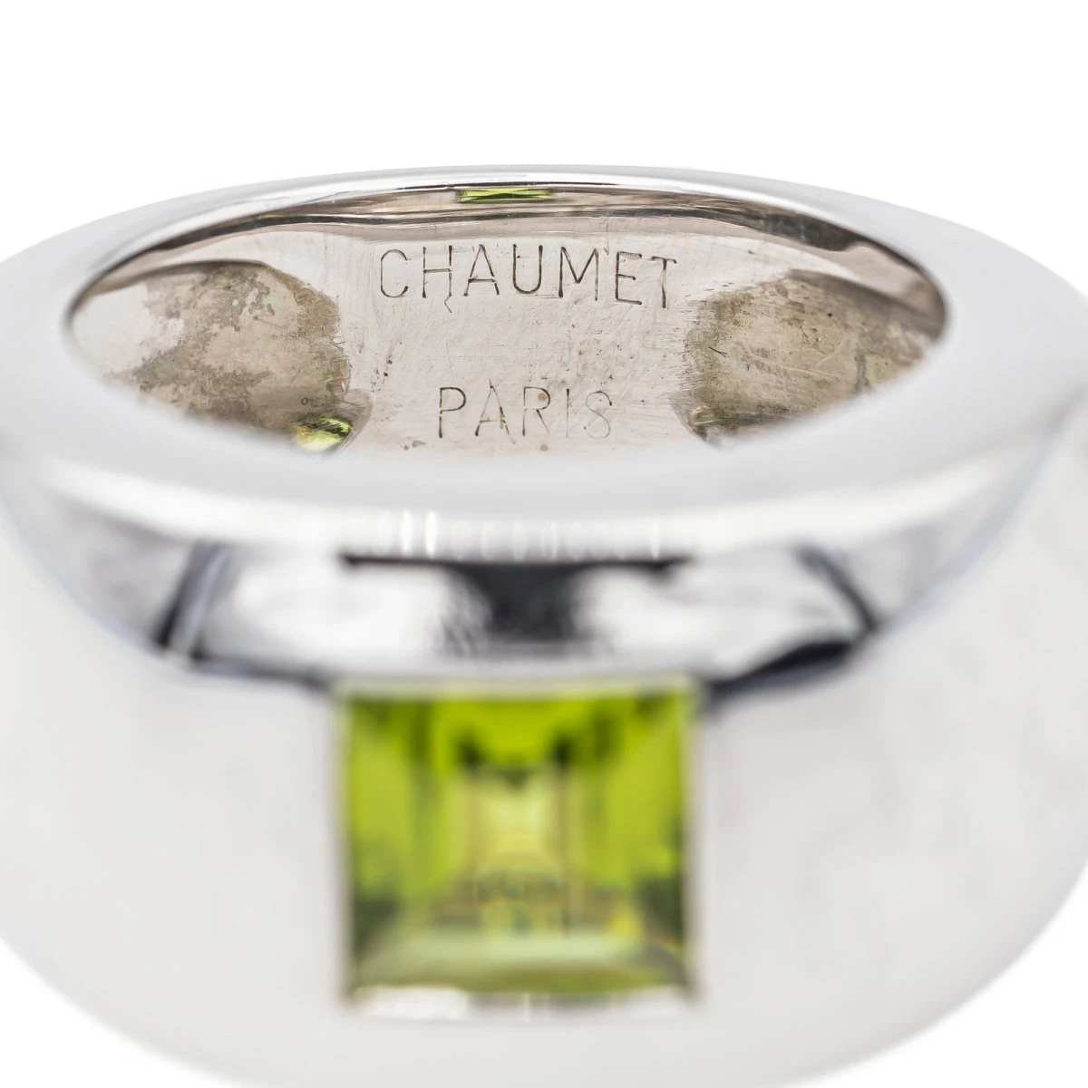 Bague signée de la maison Chaumet en or blanc 750 millièmes (18 carats). collection Bella. sertie d’un péridot carré d’environ 1.18 cts. largeur sur le dessus : 1.17 cm. épaisseur de l’anneau : 0.18 cm. numérotée : 363887. tour de doigt : 49. poids total : 11.82 g. poinçon tête d’aigle. excellent état