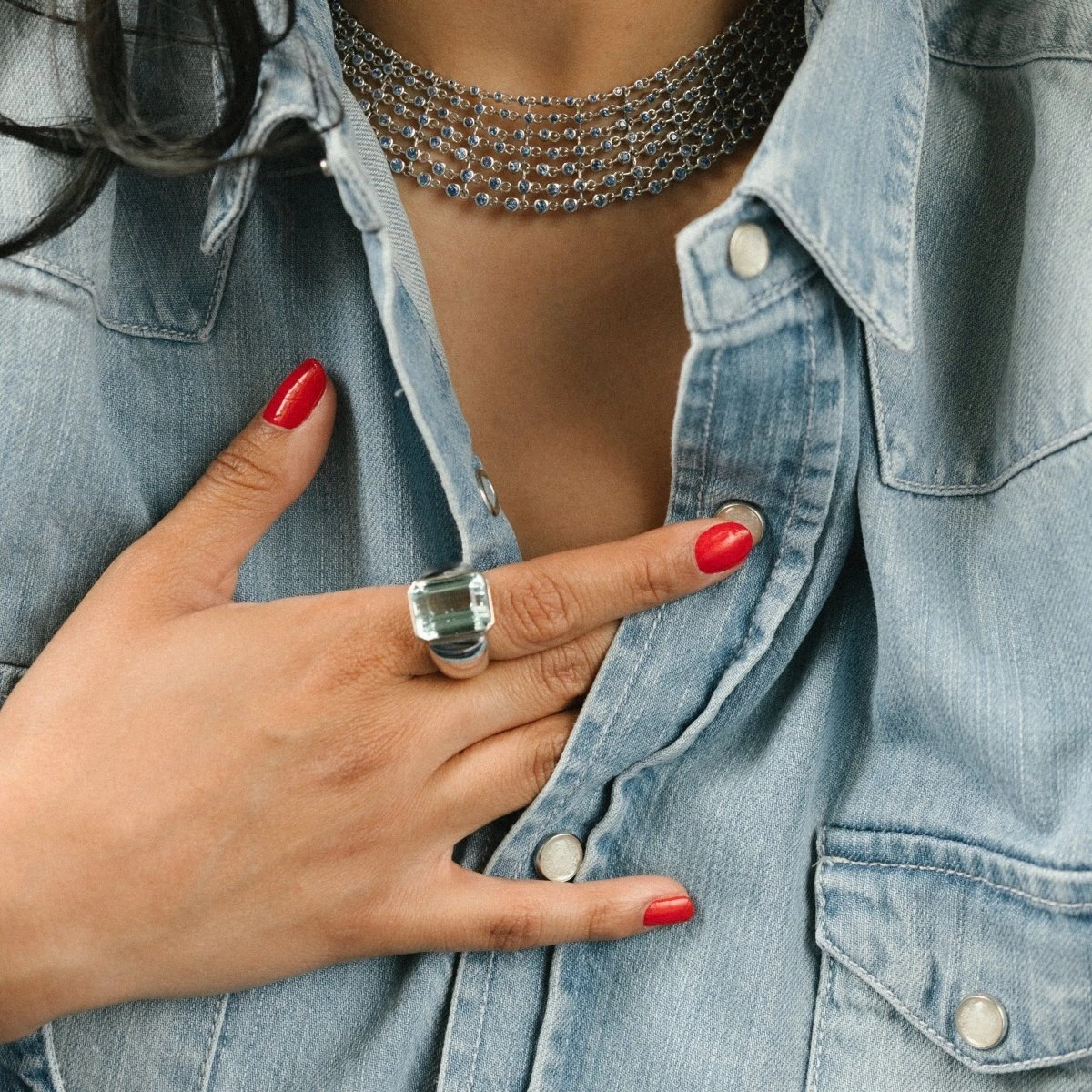 Bague Chevalière en or blanc 18 carats, sertie d’une aigue-marine.