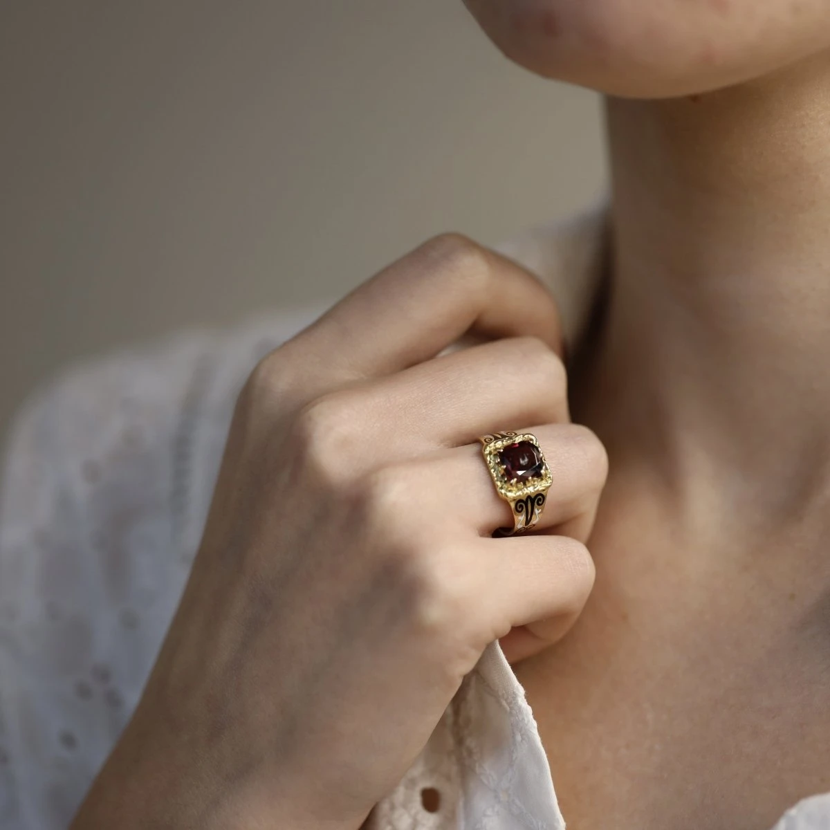 Cette bague en or jaune 18 carats, datant de l’époque Napoléon III, est un bijou raffiné au style emblématique du XIXe siècle. Elle est sertie en son centre d’un grenat taille coussin d’époque, dont la couleur profonde apporte élégance et caractère. Les côtés du corps de bague sont ornés de décors en émail, témoignant d’un savoir-faire joaillier minutieux. Réalisée avec un travail d’orfèvrerie exceptionnel, cette bague porte les poinçons français garantissant l’authenticité et la qualité de l’or. Avec sa taille 54, elle offre un confort parfait et peut être ajustée grâce à la mise à taille offerte. Un bijou chargé d’histoire, idéal pour les amateurs de pièces anciennes et de joaillerie d’exception.