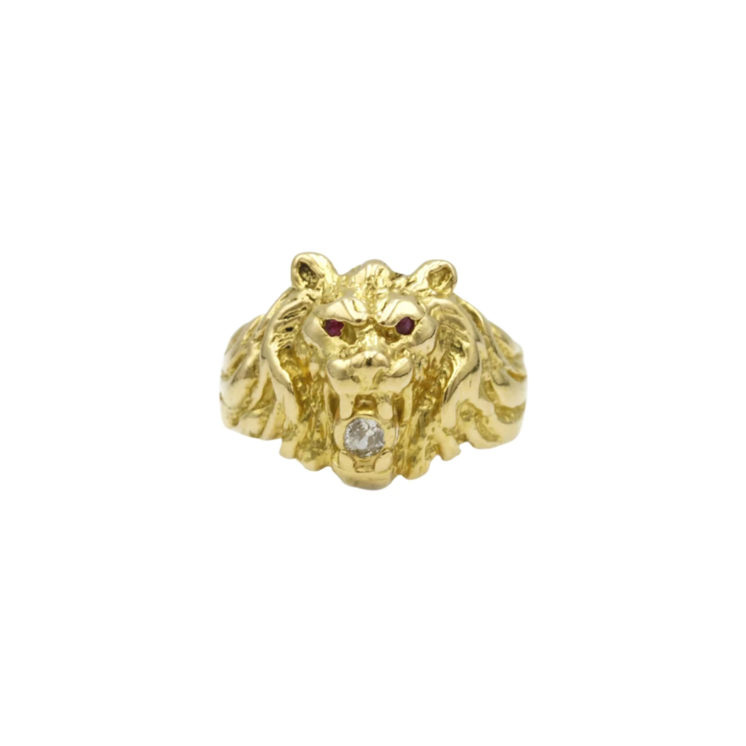 Bague Chevalière en or jaune 18 carats, à forme de tête de lion, sertie de 2 petits rubis au niveau des yeux et d’un diamant taille ancienne.