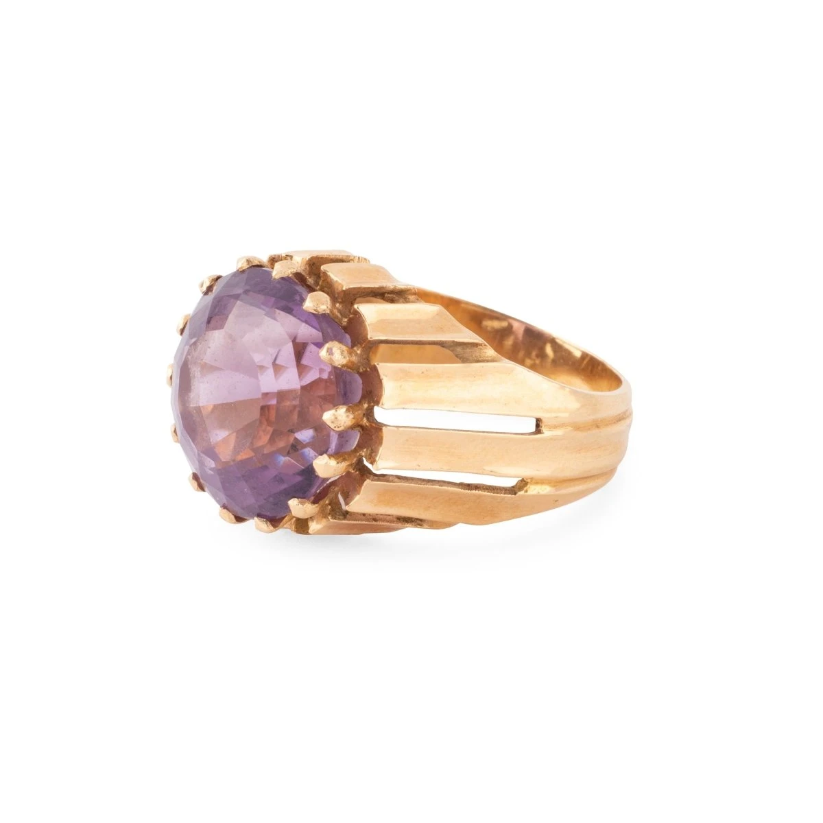 Bague Cocktail en or jaune 18 carats, la monture ajourée sertie d’une améthyste ronde