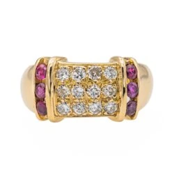 Bague en or jaune 750 millièmes (18 carats). sertie de diamants et de rubis. 12 diamants taille brillant. d’un poids total d’environ 0.84 ct (chaque diamant d’un poids d’environ 0.05 ct). entourés de 6 rubis taille rond. d’un poids total d’environ 0.84 ct. (chaque rubis d’un poids d’environ 0.05 ct). largeur sur le dessus : 1.16 cm. tour de doigt : 57. poids total : 14.21 g. poinçon hibou. excellent état