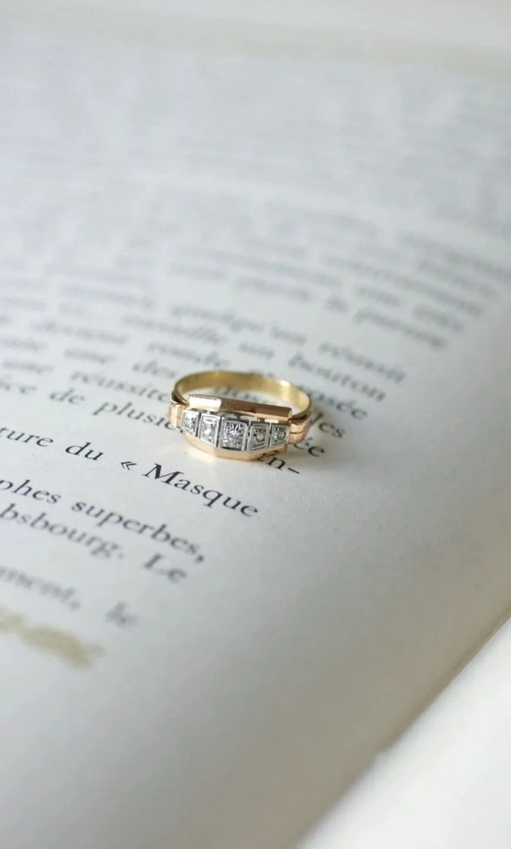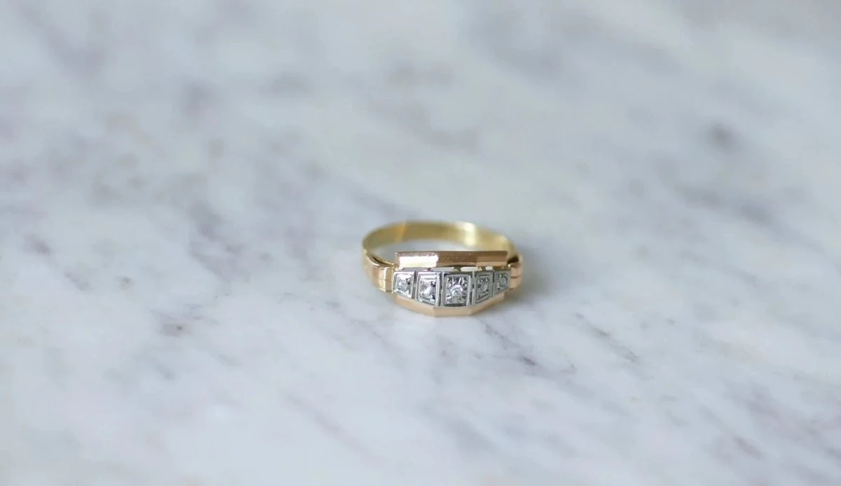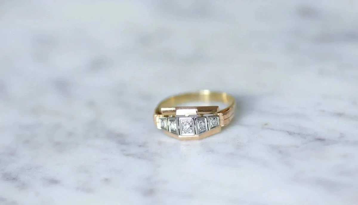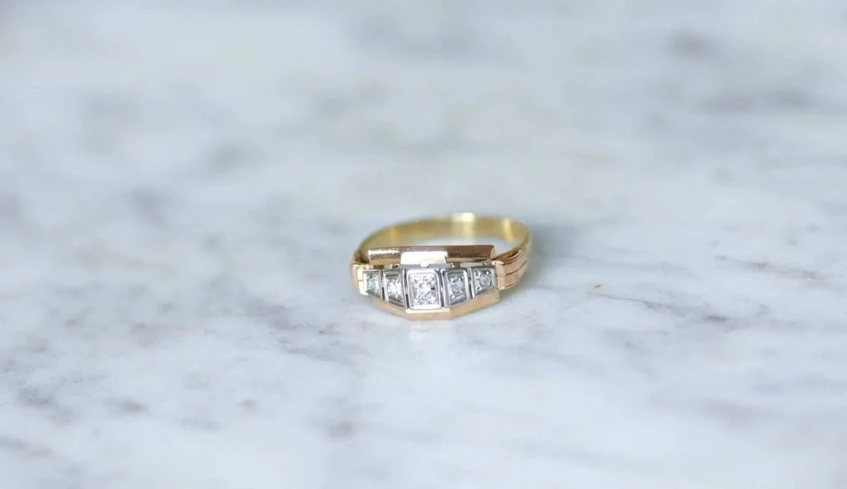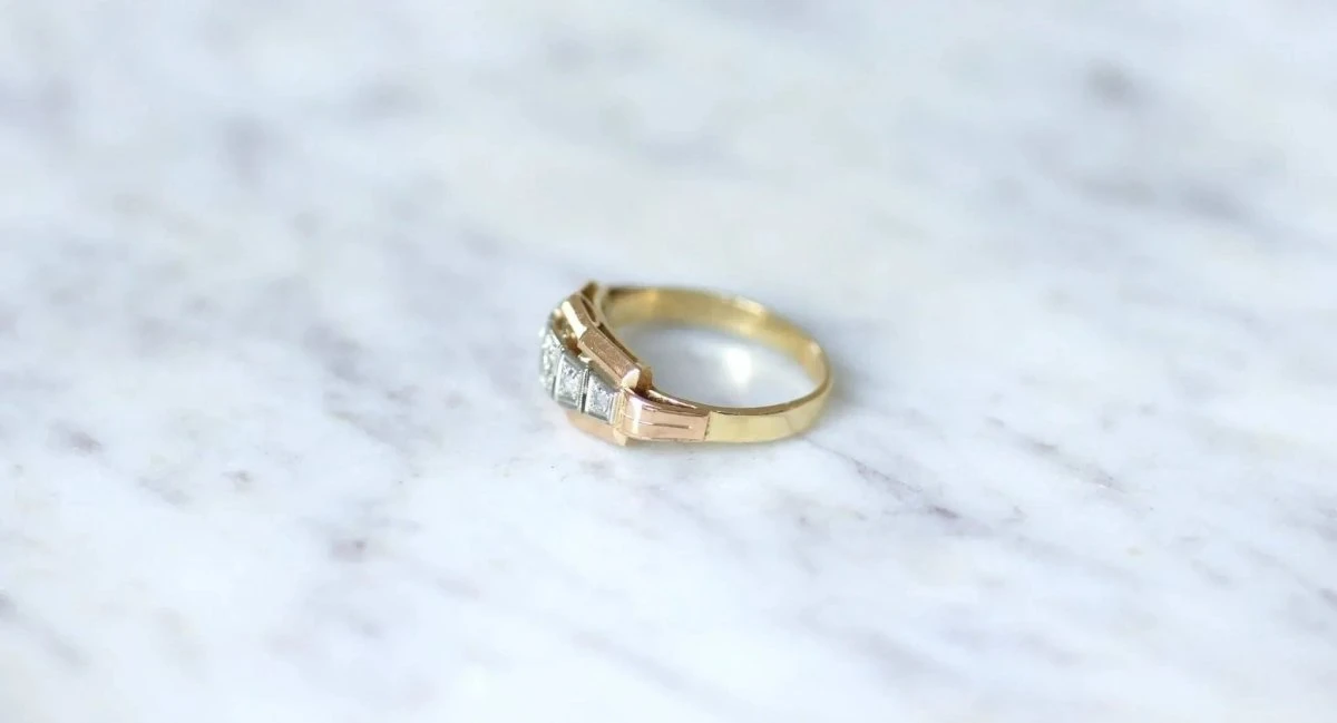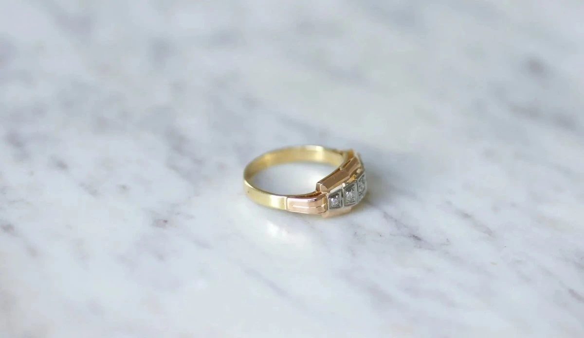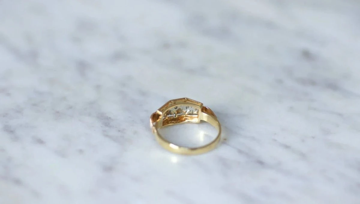Bague bandeau en or jaune, blanc, et rose 18kt (poinçon: tête d’aigle) sertie en son centre d’un diamant taillé en 8×8 dans un épaulement de deux diamants taillés en rose.