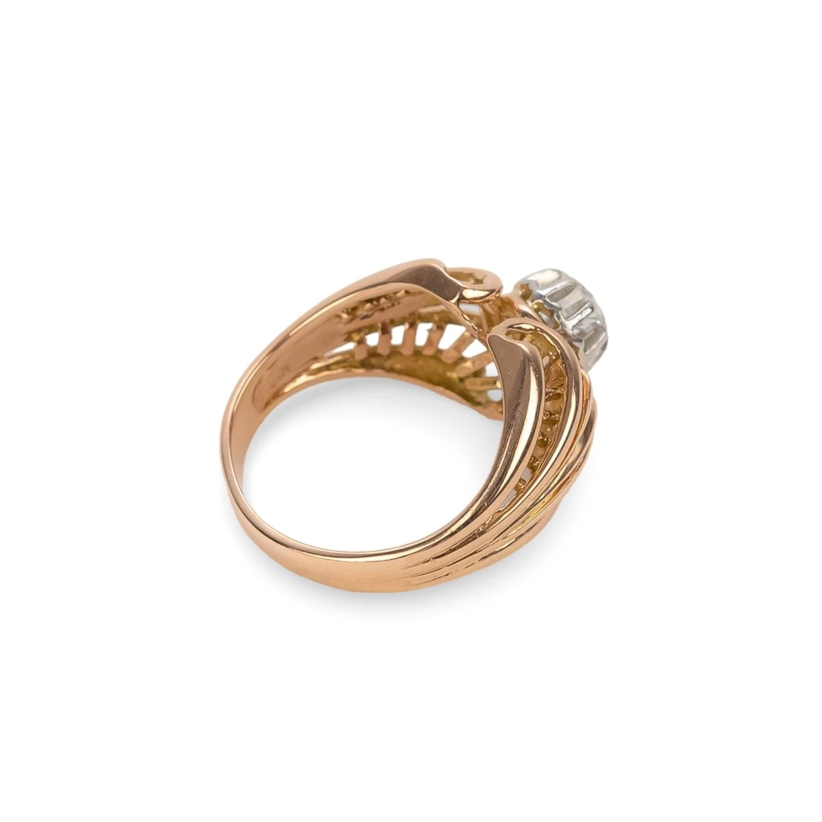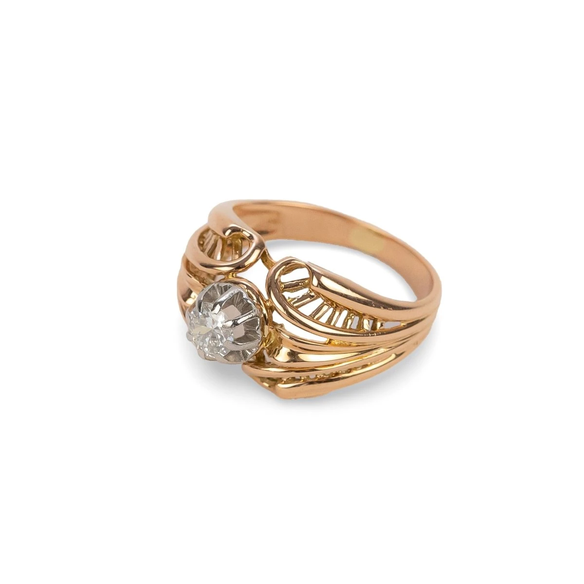 Bague Dôme ajourée en or jaune 18 carats sertie d’un diamant rond. Circa 1920.