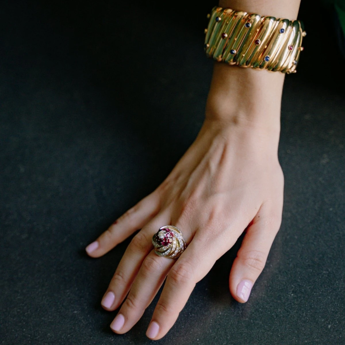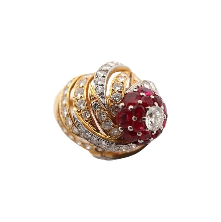 Bague Dôme MARCHAK à décor mouvementé d’or jaune 18 carats, ornée d’un diamant central entouré de diamants et de rubis en fleur.