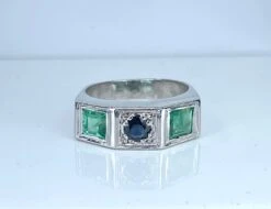 Bague jonc en or blanc 18 carats ornée au centre d’un saphir poids: 0,20 carat environ épaulé de 2 émeraudes poids:0,40 carat. Parfait état, travail français.