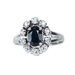 Bague marguerite en or blanc 18 carats ornée d’un saphir foncé poids:1,02 carat environ entouré de 10 diamants poids:0,10/0,15 carat environ. Ravissant panier à décor de triangles. Parfait état.