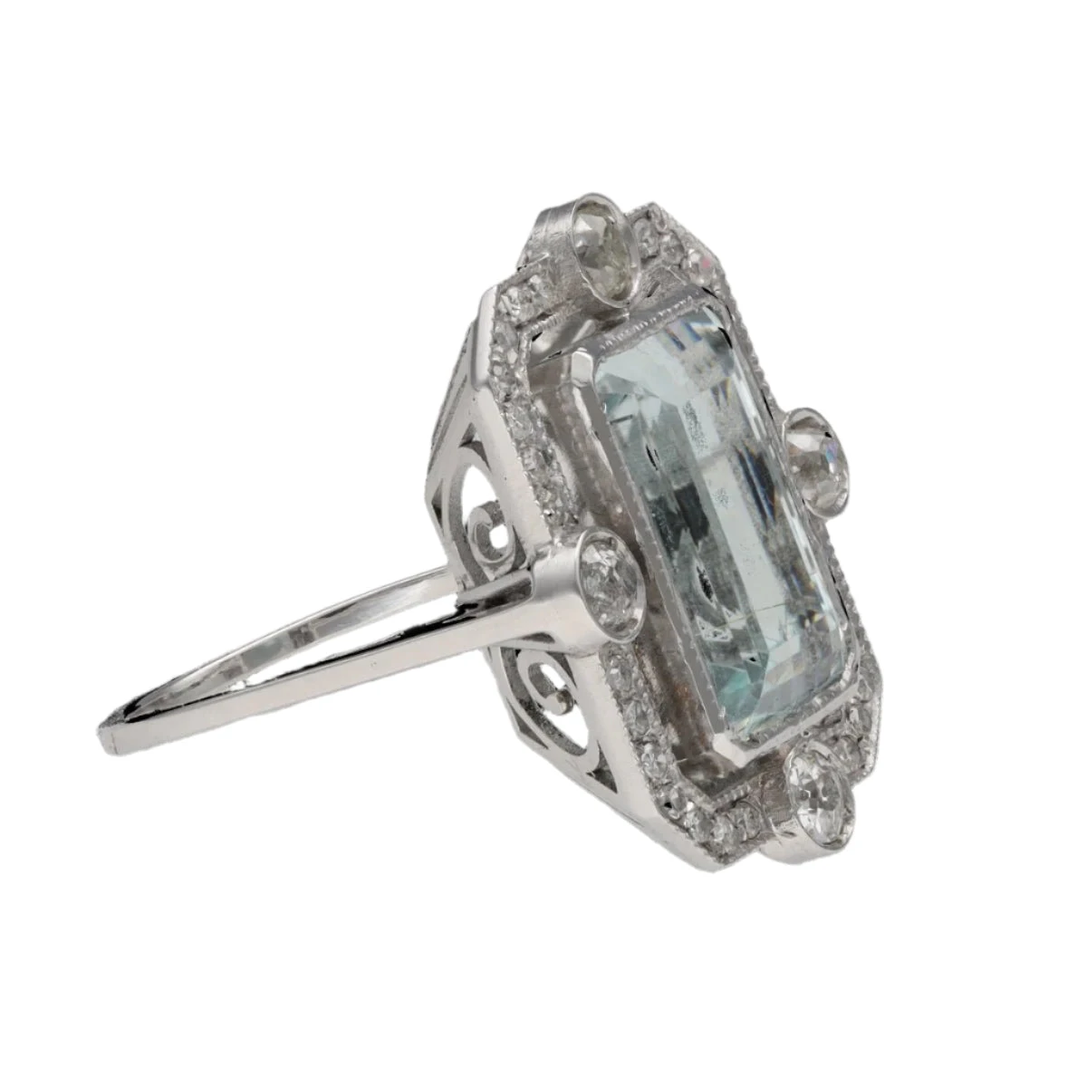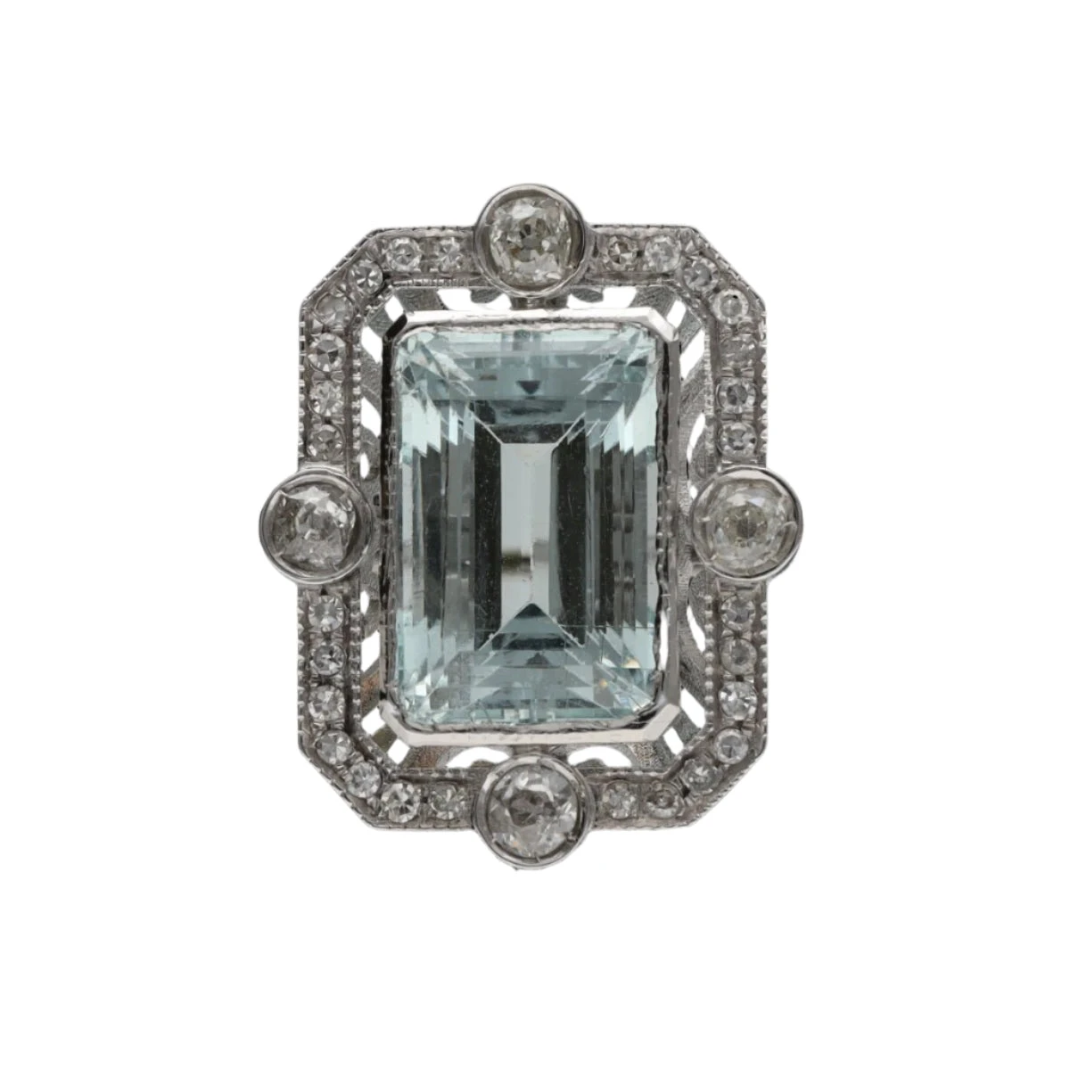 Bague en or gris 18 carats sertie d’une aigue marine de 5,0 carat environ et 0,60 carat de diamants taille ancienne J-SI. Taille 55. Mise à taille offerte. Datant des années 1970.