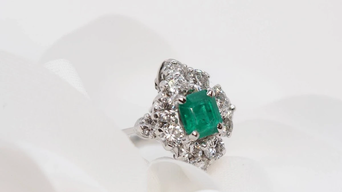 - Au centre : une émeraude rectangle de 1 ct environ ;