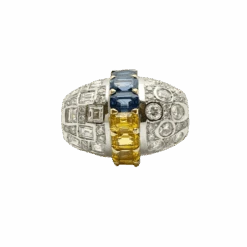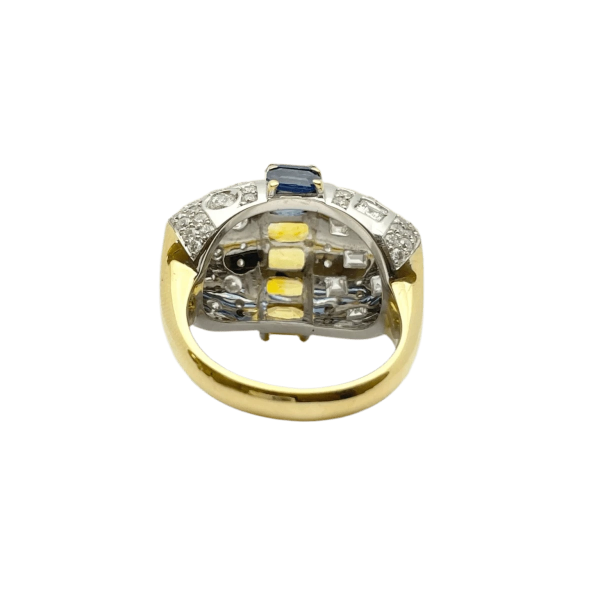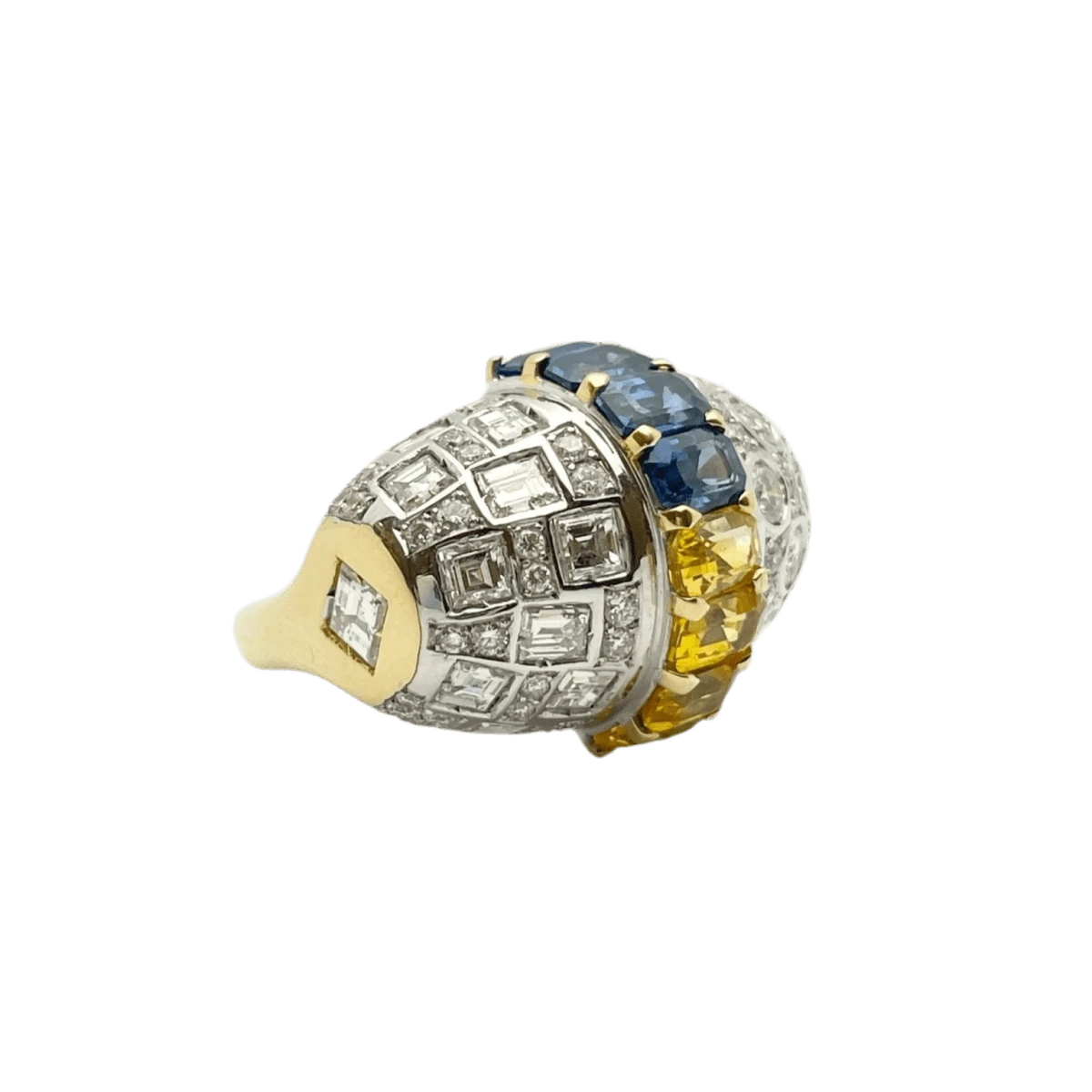 Bague en or jaune et or blanc 18 carats, sertie de saphirs naturels ovales et taillés à facettes et de diamants naturels taillés en brillant