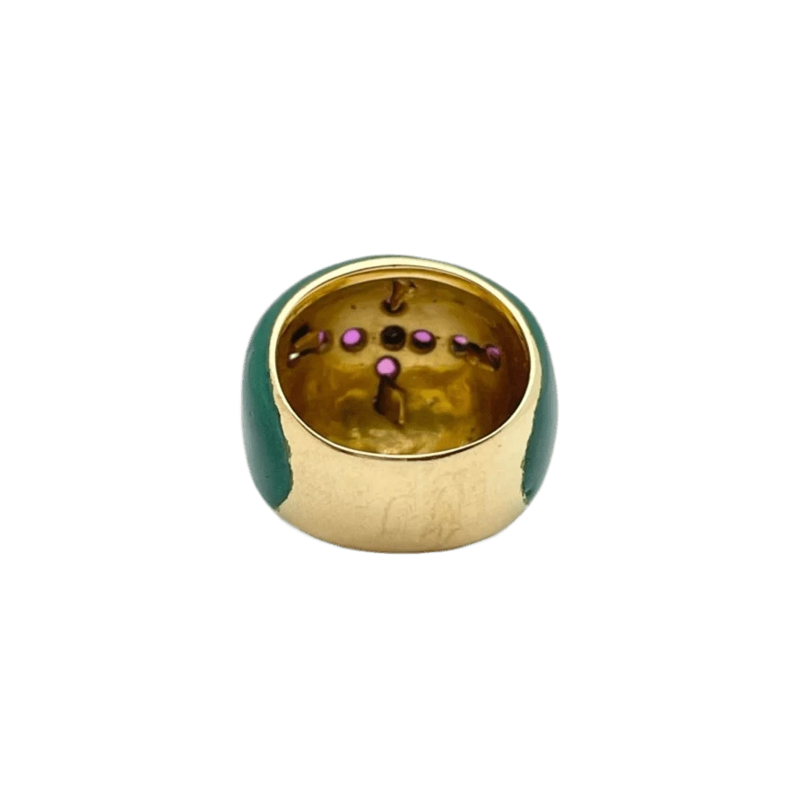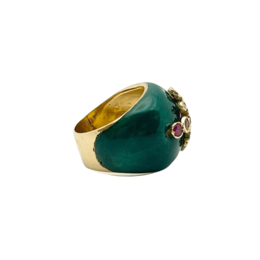 Bague en or jaune 18 carats, ornée de diamants naturels taille brillant et de rubis naturels facettés, agrémentée de délicats détails en émail.
