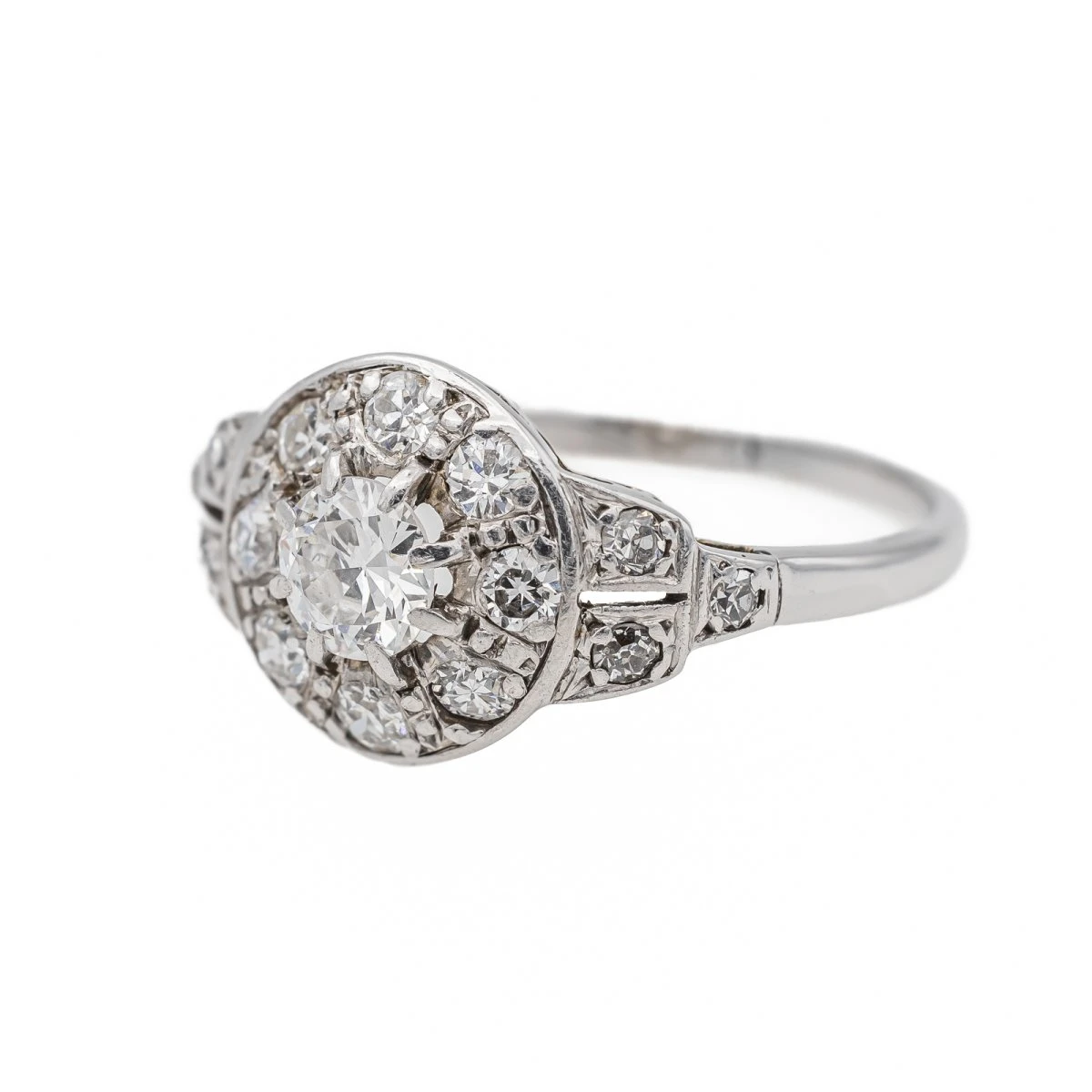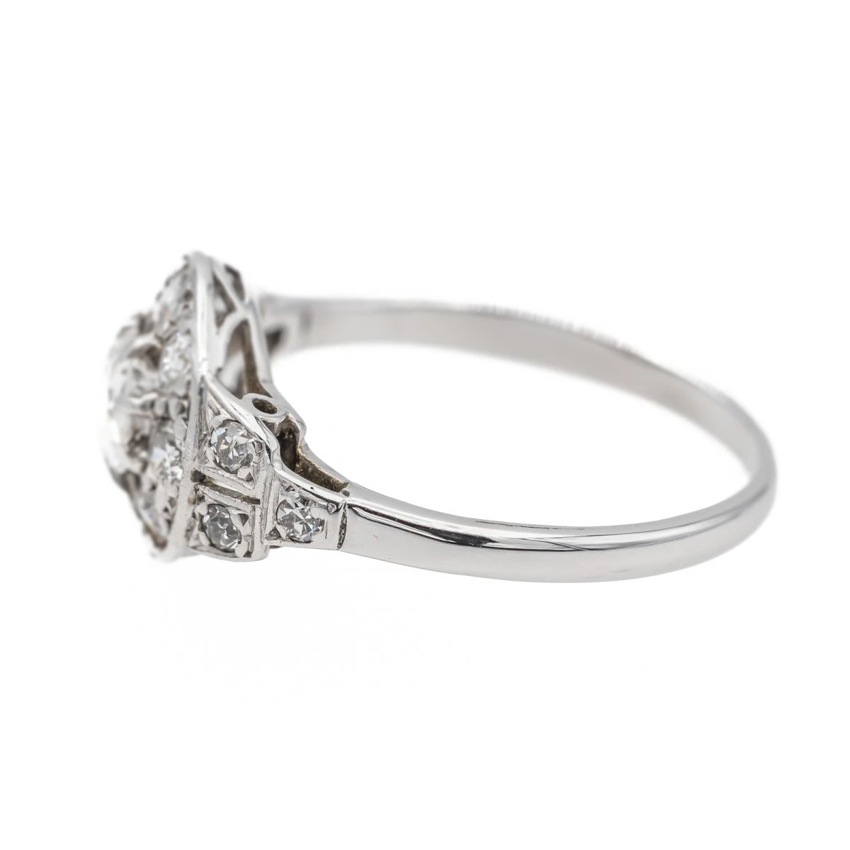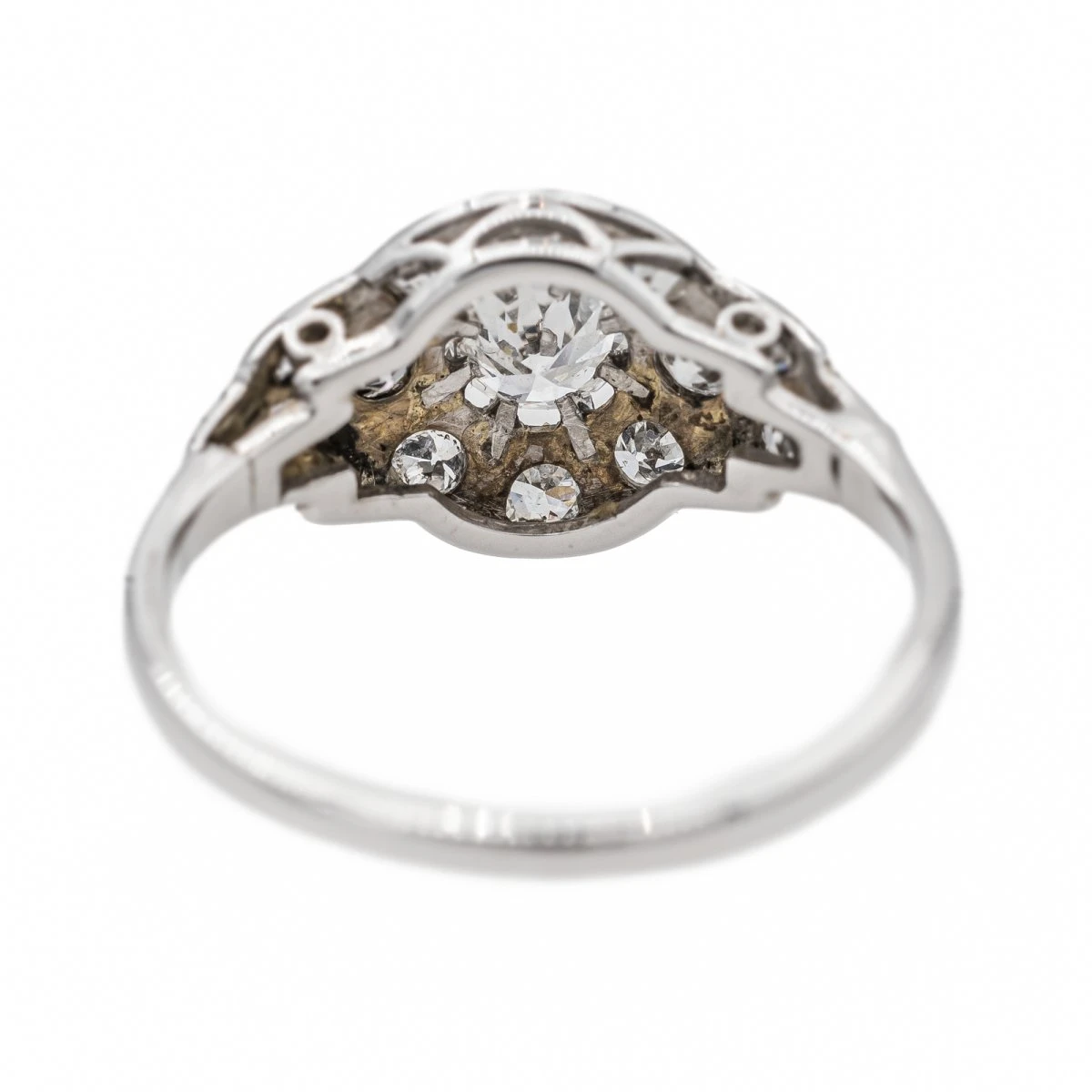 Bague Art Déco en or blanc 750 millièmes (18 carats). sertie de diamants taille ancienne. le diamant central d’un poids total d’environ 0.33 ct. entouré de 8 diamants d’environ 0.025 ct chacun. 4 diamants d’environ 0.02 ct chacun et 2 diamants d’envrion 0.01 ct cahcun. poids total diamants environ : 0.63 ct. largeur sur le dessus : 0.98 cm. tour de doigt : 51. poids total : 2.09 g. excellent état