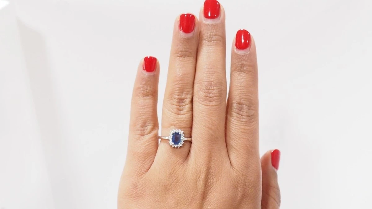 - Sertie au centre d’un saphir de Ceylan de 1,11ct ;