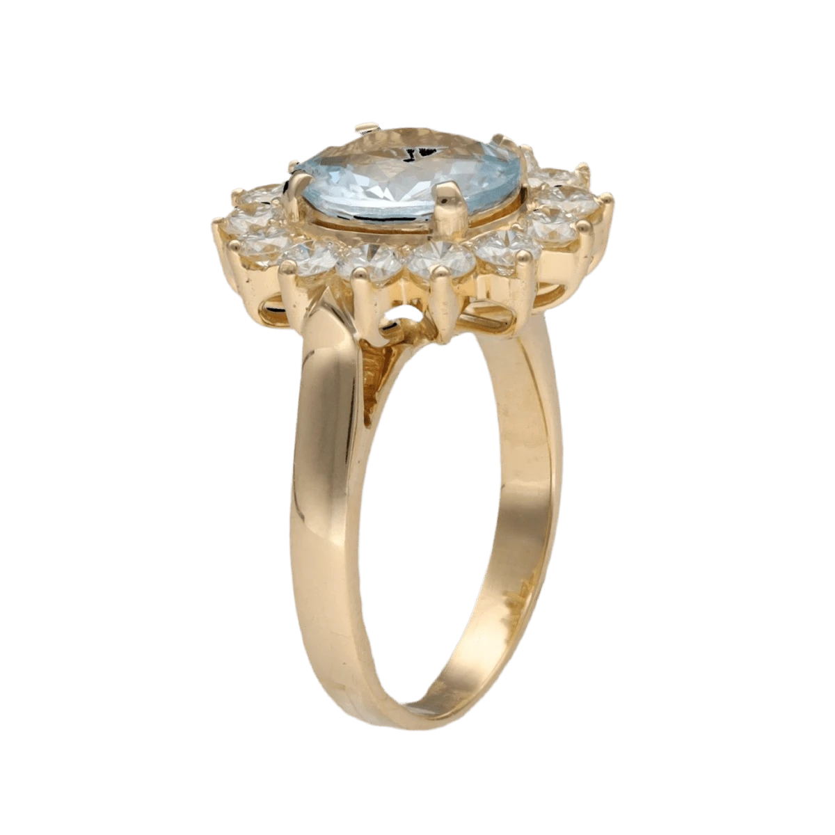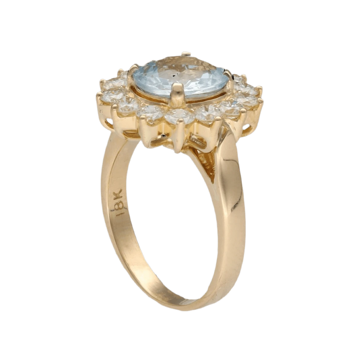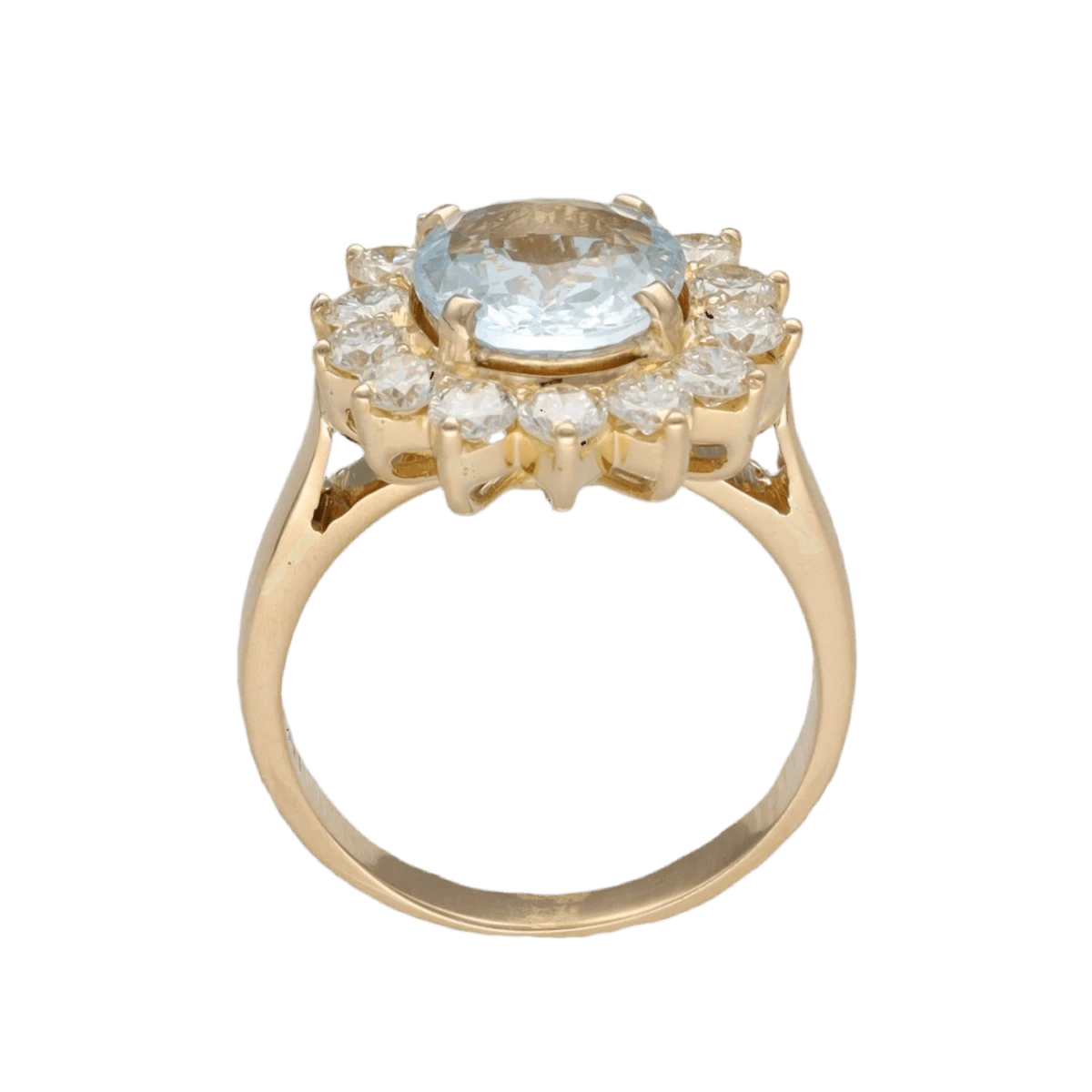 Bague en or jaune 18 carats sertie d’une aigue-marine ovale 2,37 carats, mise en valeur par un entourage de diamants taille brillant.Â