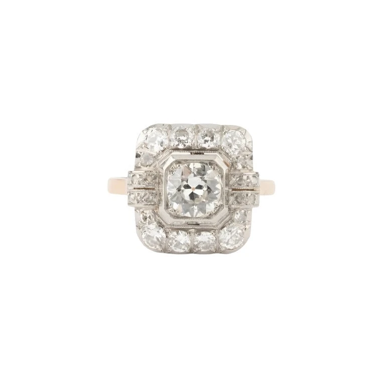 Bague en or rose 18 carats et platine, sertie d’un diamant central avec un entourage de diamants.