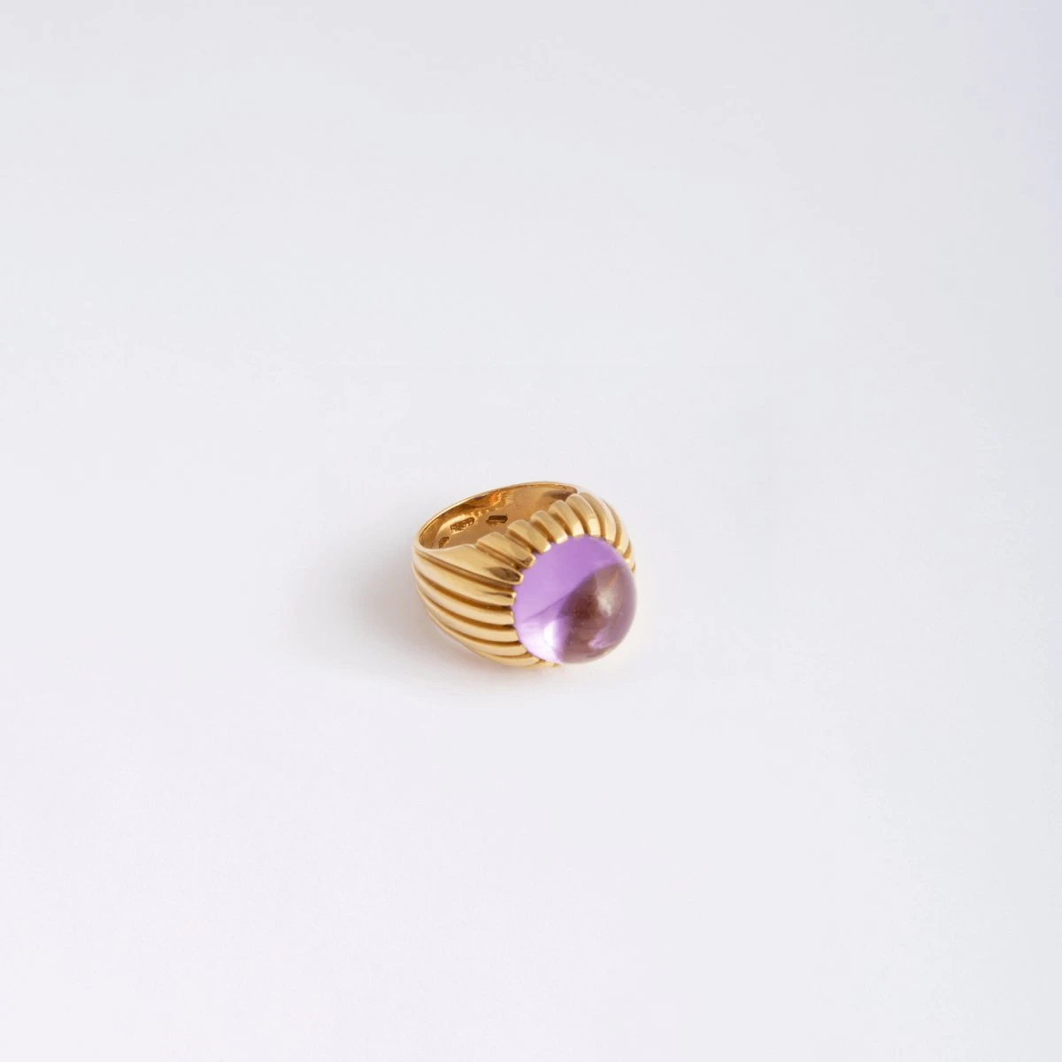 Bague FRED en or jaune 18 carats ornée d’un cabochon d’améthyste de forme dôme.