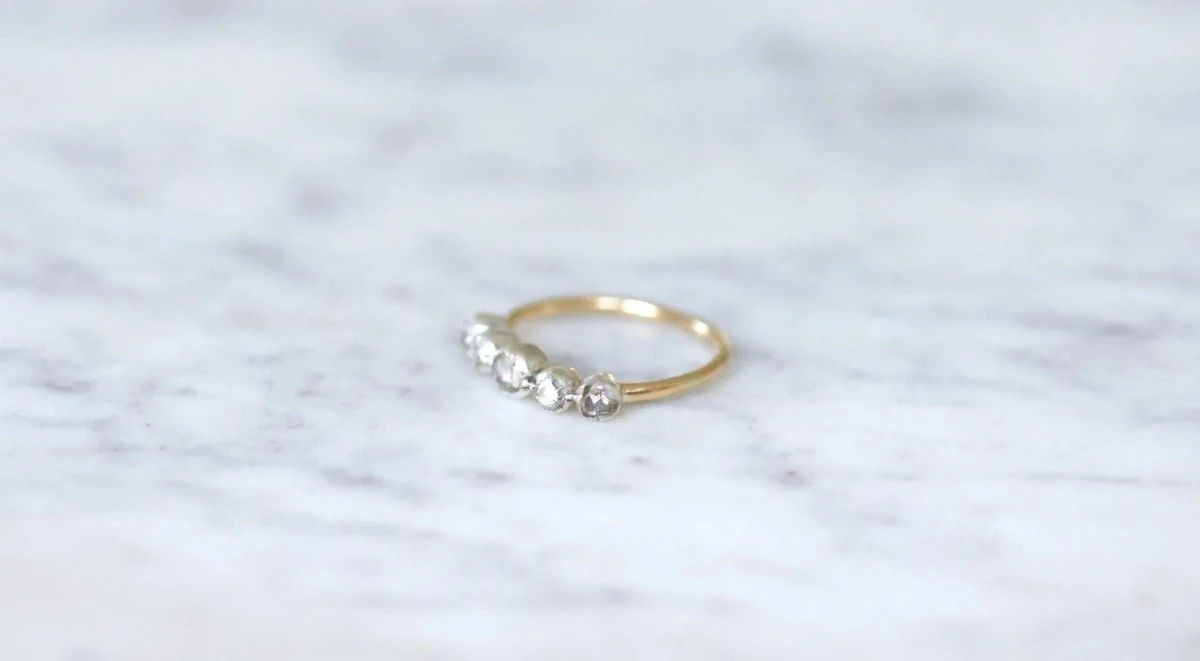 Bague jarretière en or jaune 18Kt et argent (poinçons : hibou et cygne), sertie de cinq diamants taillés en rose montés sur paillon.