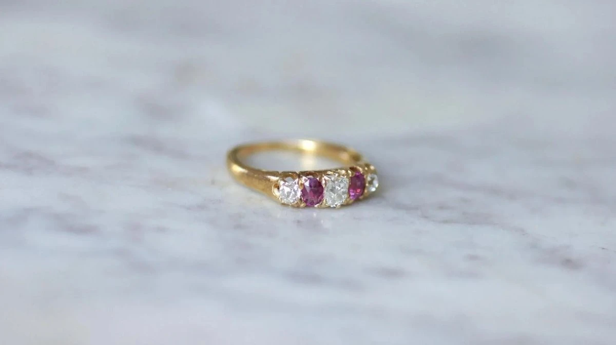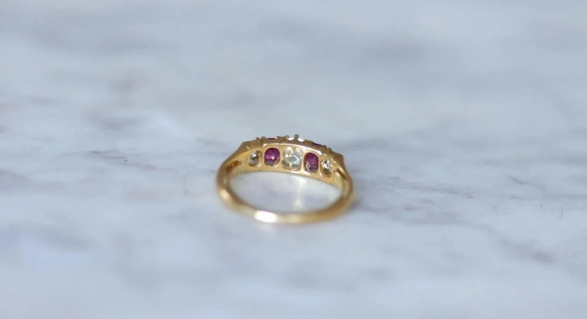 Bague jarretière en or jaune 18Kt (poinçon : hibou), sertie de trois diamants taillés à l’ancienne, dont le poids total est estimé à environ 0.40Ct, et de deux rubis pesant au total environ 0.40Ct.