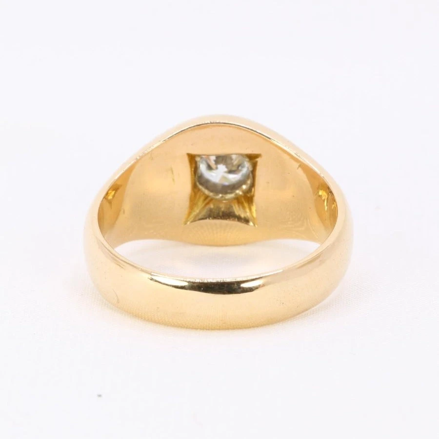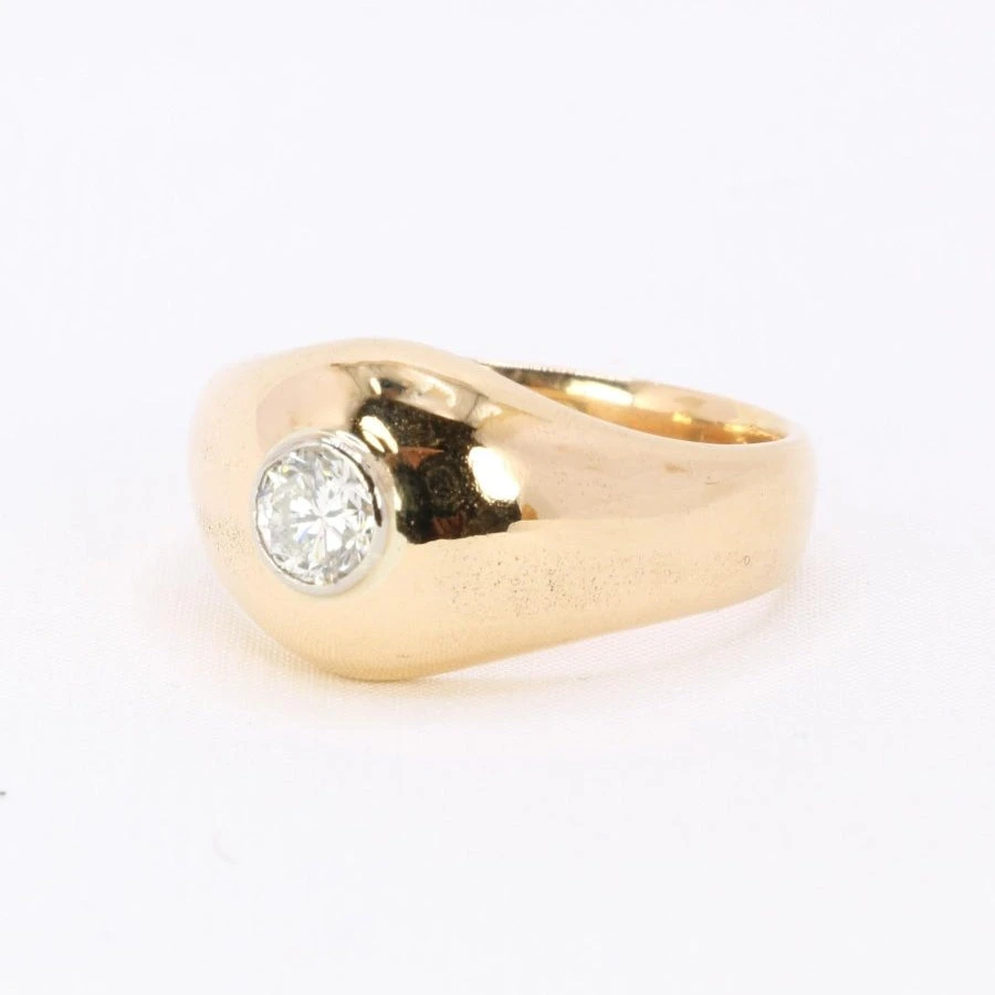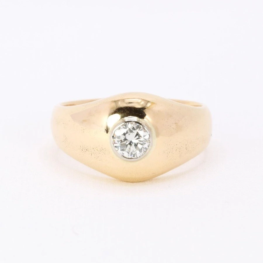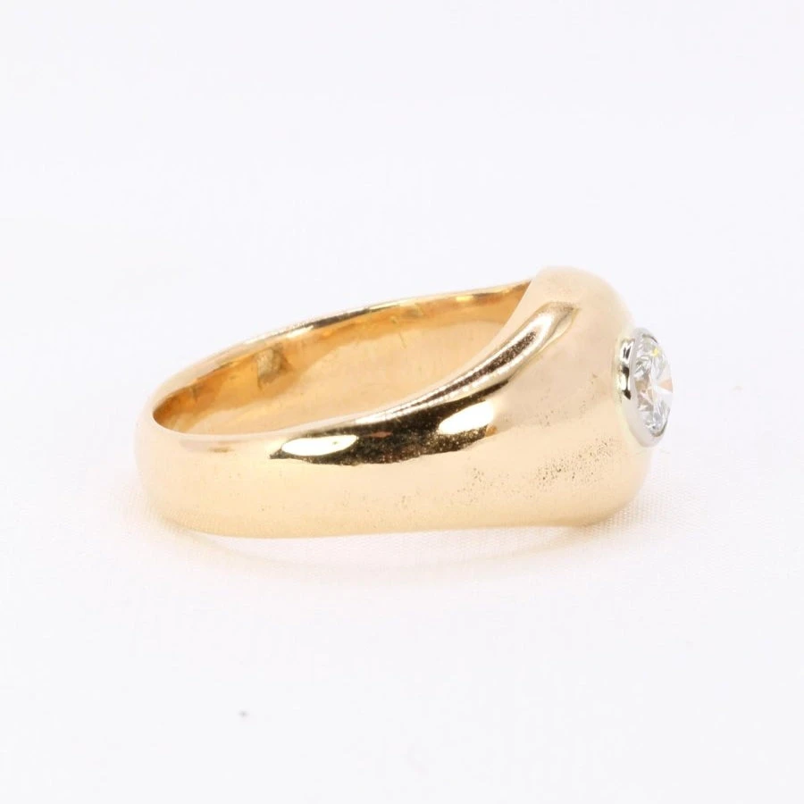 Bague Jonc en or jaune18 carats sertie en son centre d’un diamant taille brillant de belle qualité (GH VVS). Bijou vintage, Circa années 1970. A noter la présence de bulles sur l’anneau. Largeur de la bague : 1,1 cm.