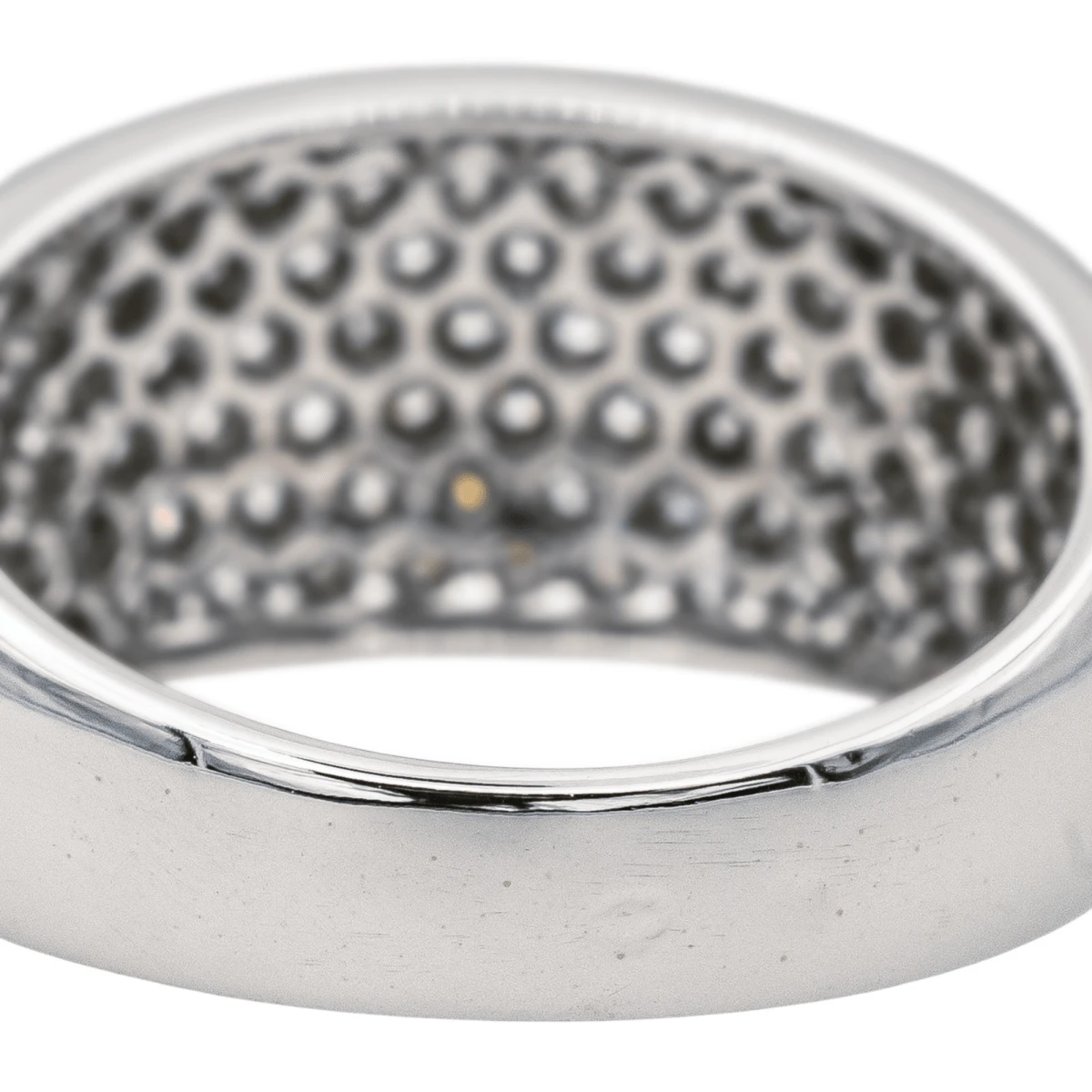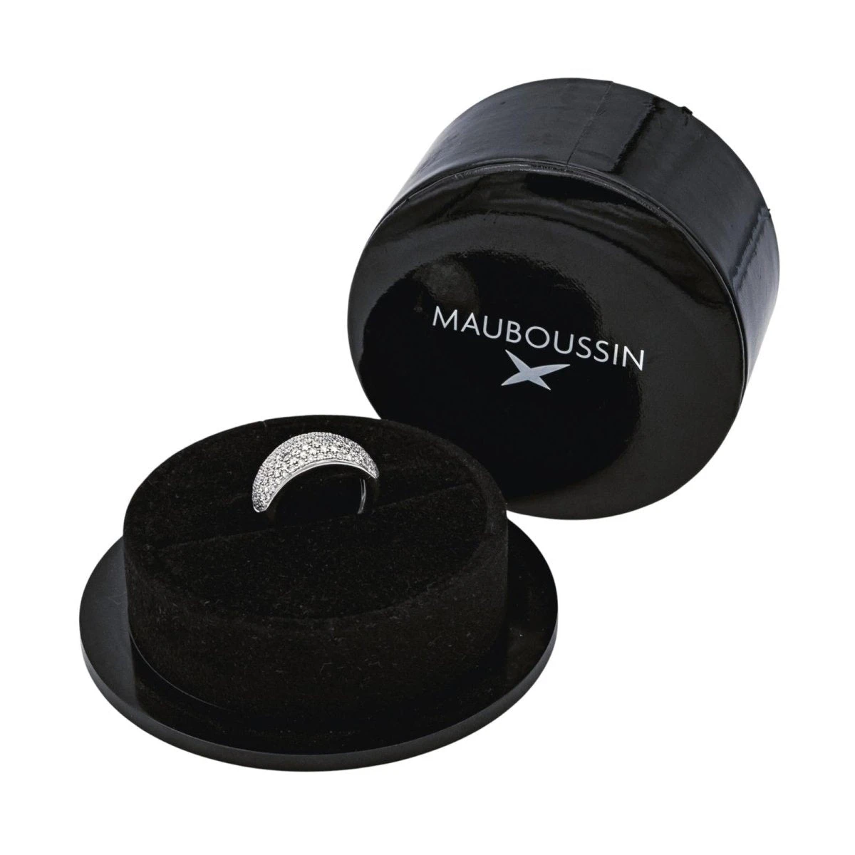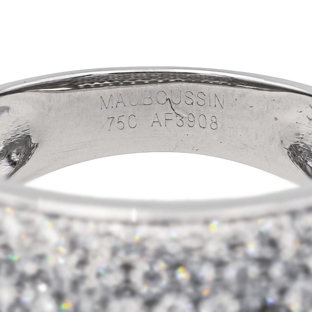 Bague signée de la Maison Mauboussin en or blanc 750 millièmes (18 carats). modèle C’est toi la Star. pavée de diamants. 100 diamants taille brillant. d’un poids total d’environ 1.00 ct. (chaque diamant d’un poids d’environ 0.01 ct). largeur sur le dessus : 1.03 cm. tour de doigt : 54. poids total : 7.21 g. poinçon tête d’aigle. numérotée. excellent état