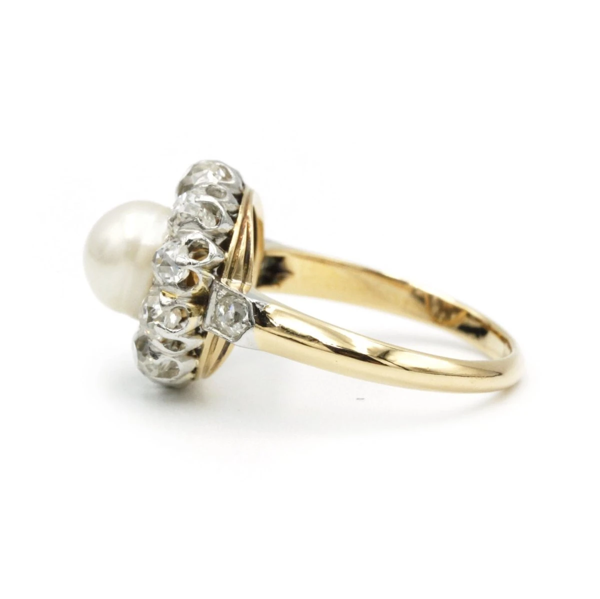 Bague en or jaune 18 carats et platine, sertie d’une perle entourée de 12 diamants taille ancienne (2,50 carats environ).