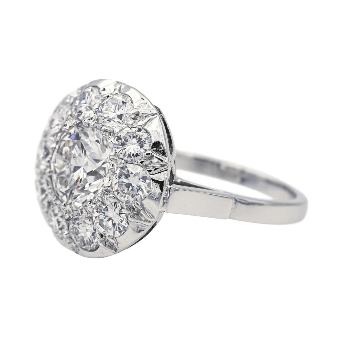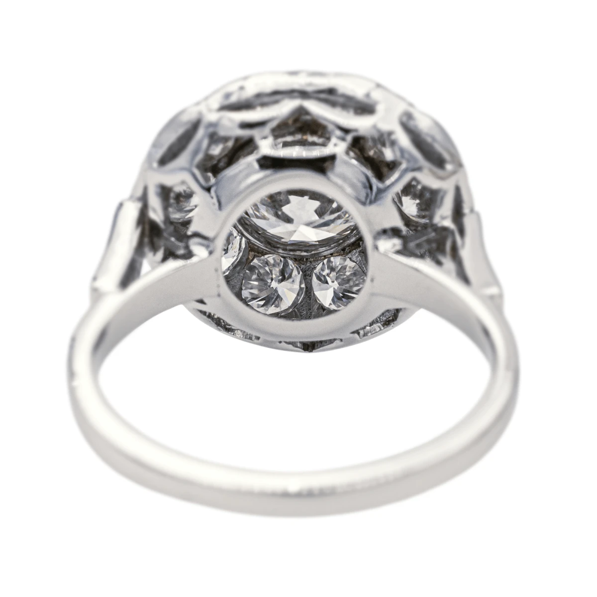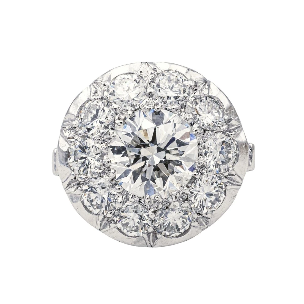 Bague en platine 950 millièmes. sertie de 11 diamants. 1 diamant taille brillant. d’un poids total d’environ 1.19 cts. entouré de 10 diamants taille brillant. d’un poids total d’environ 1.00 cts. (chaque diamant d’un poids d’environ 0.10 ct). poids total diamants environ : 2.19 cts. largeur sur le dessus : 1.42 cm. tour de doigt : 49.5. poids total : 5.46 g. poinçon mascaron. excellent état