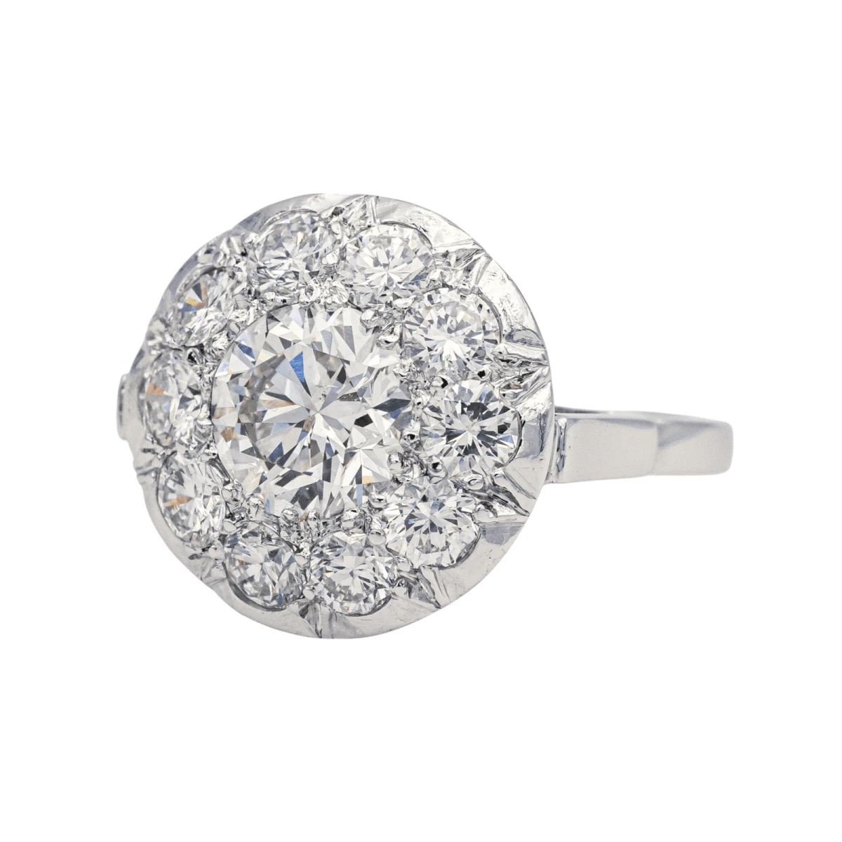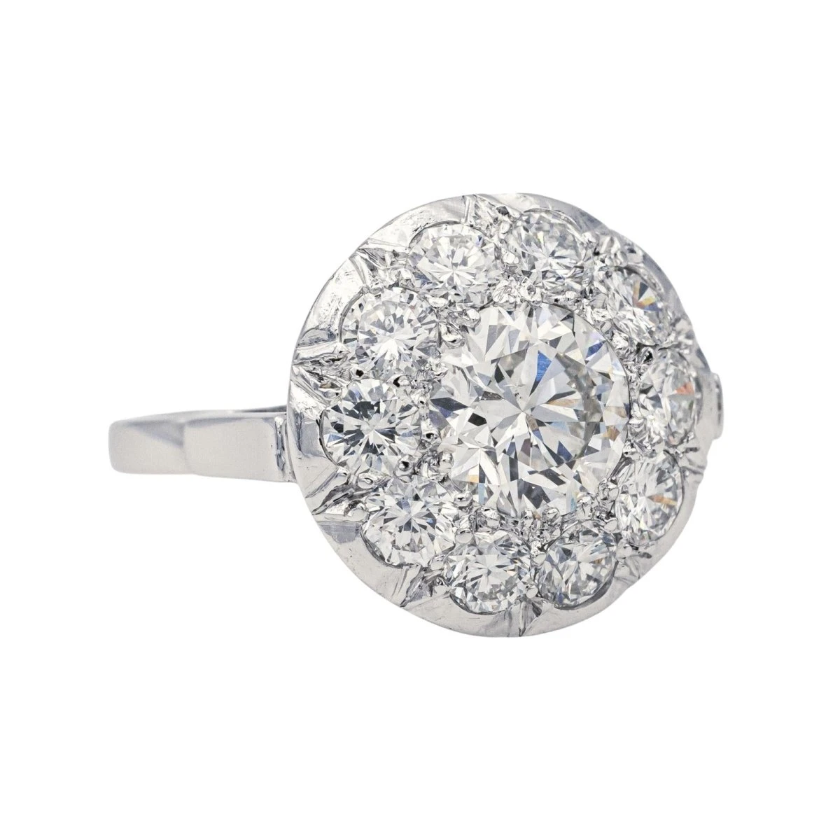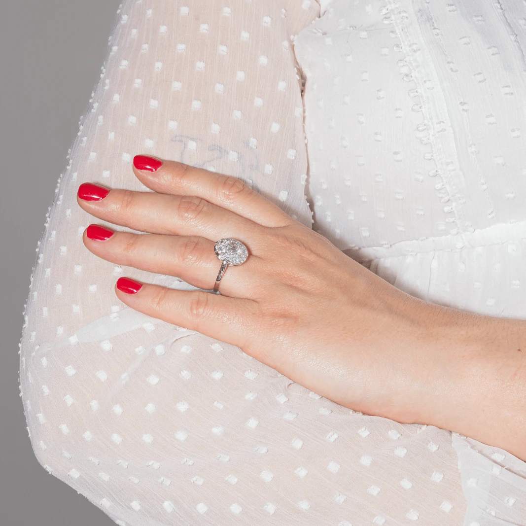 Bague en platine 950 millièmes. sertie de 11 diamants. 1 diamant taille brillant. d’un poids total d’environ 1.19 cts. entouré de 10 diamants taille brillant. d’un poids total d’environ 1.00 cts. (chaque diamant d’un poids d’environ 0.10 ct). poids total diamants environ : 2.19 cts. largeur sur le dessus : 1.42 cm. tour de doigt : 49.5. poids total : 5.46 g. poinçon mascaron. excellent état