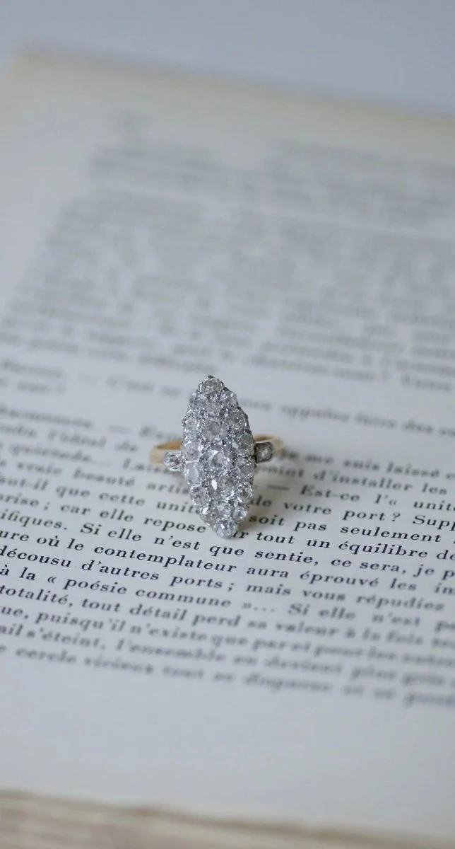 Bague marquise en or rose 18Kt et platine (poinçons : hibou et mascaron), entièrement pavée de diamants taillés à l’ancienne, dont le poids total est estimé à environ 3,75 Cts (couleur estimée H à J, pureté estimée VS à SI).