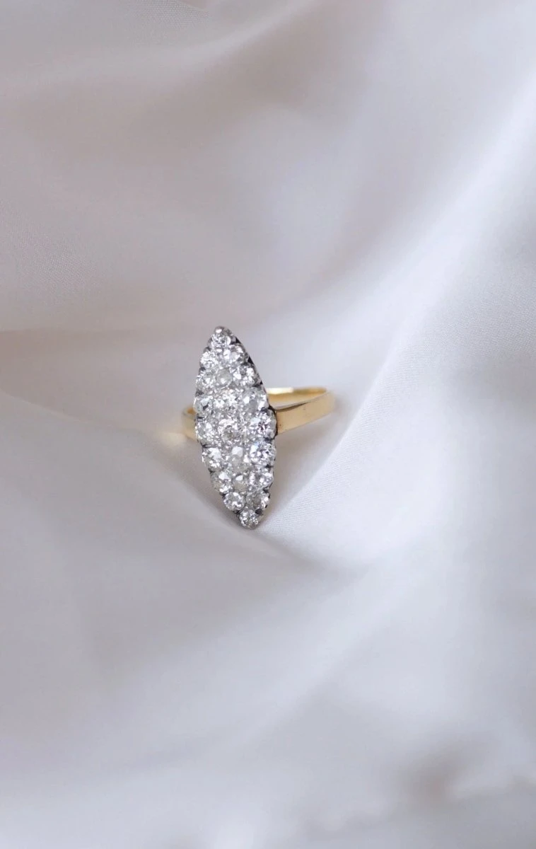 Bague Marquise ancienne en or jaune 18kt et platine (poinçon hibou et mascaron) entièrement pavée de diamants taillés à l’ancienne et de deux diamants taillés en rose.