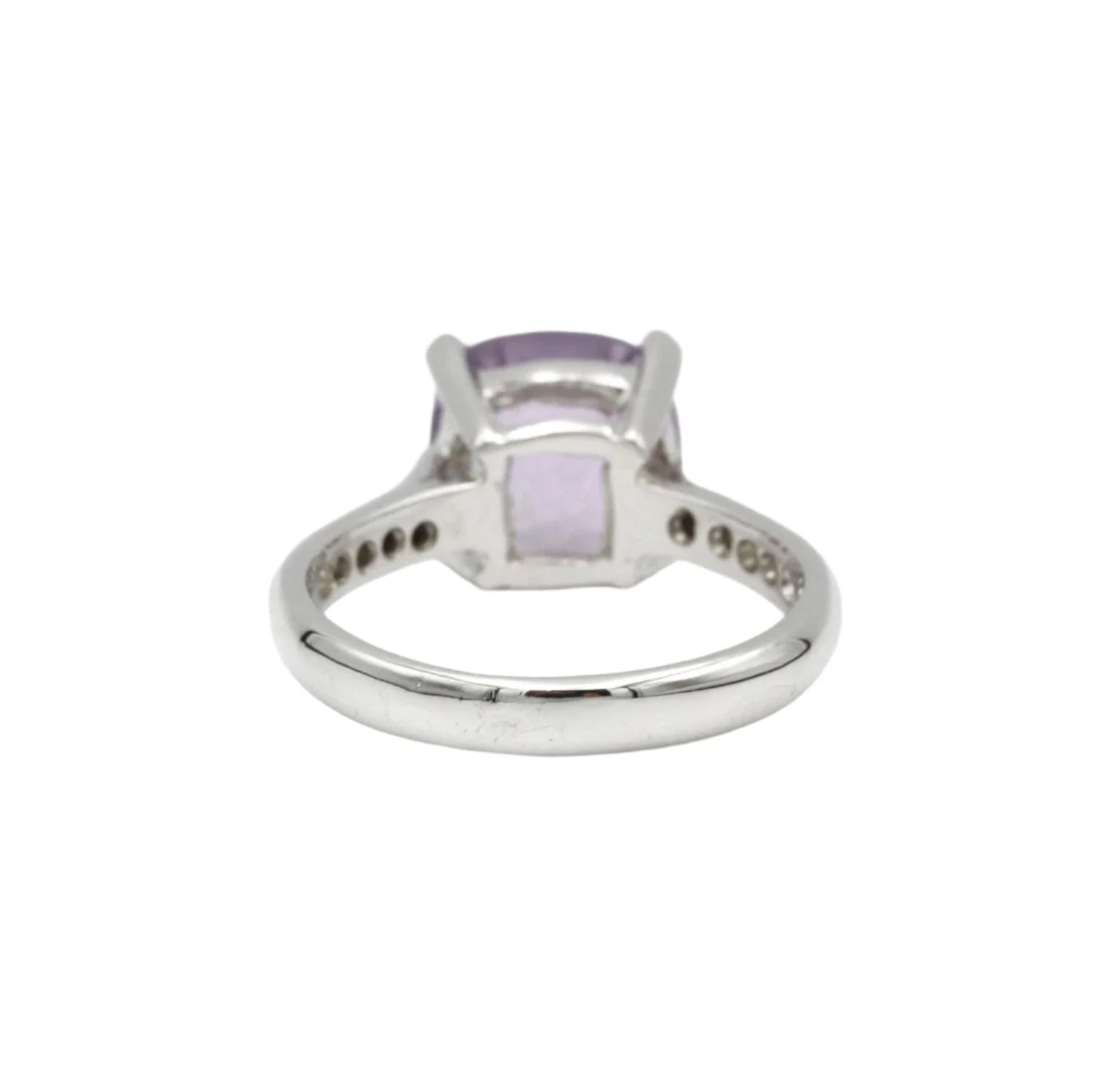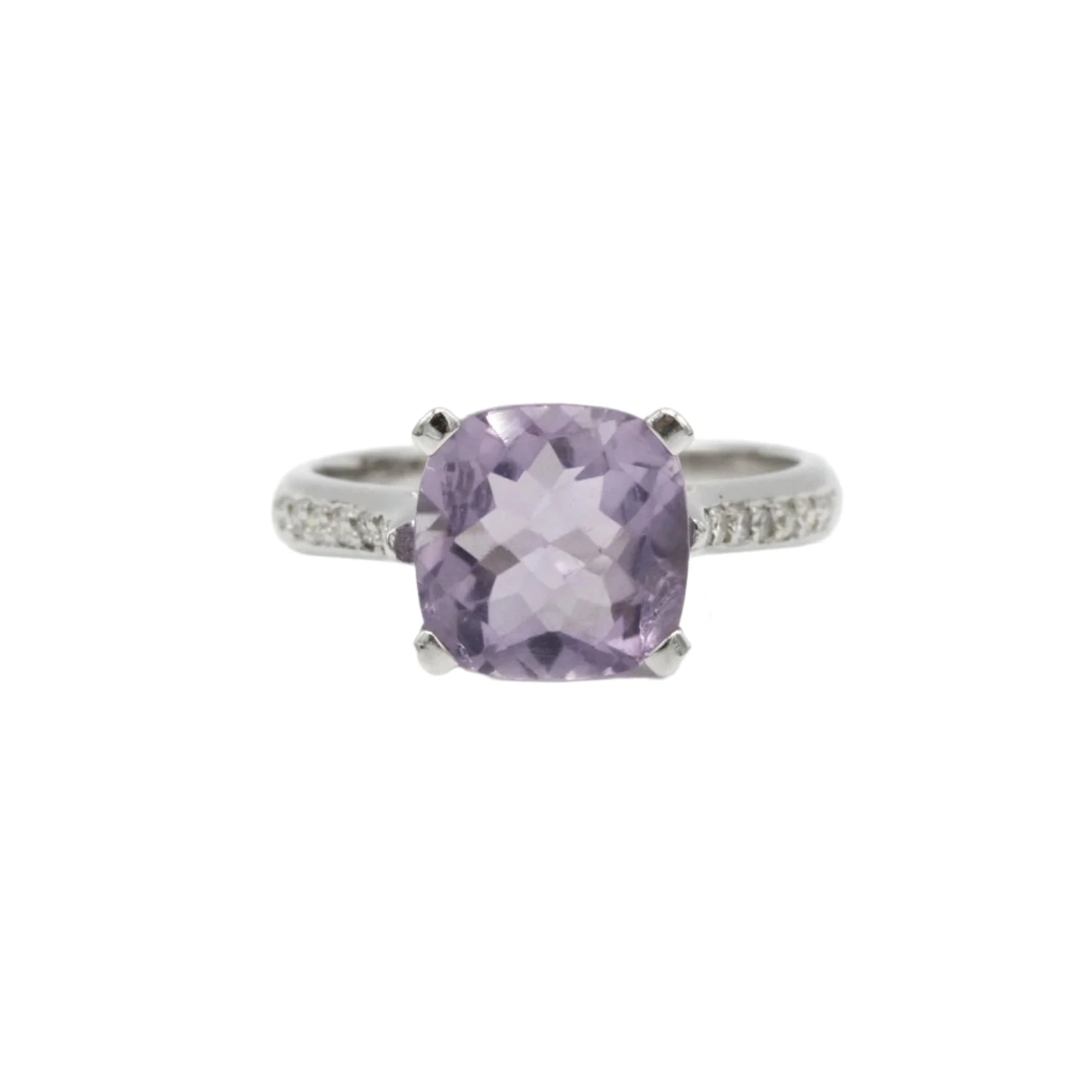 Bague en or blanc 750‰, sertie d’une améthyste taille coussin modifié d’1,80 carats environ, accompagnée par 14 diamants taille brillant.