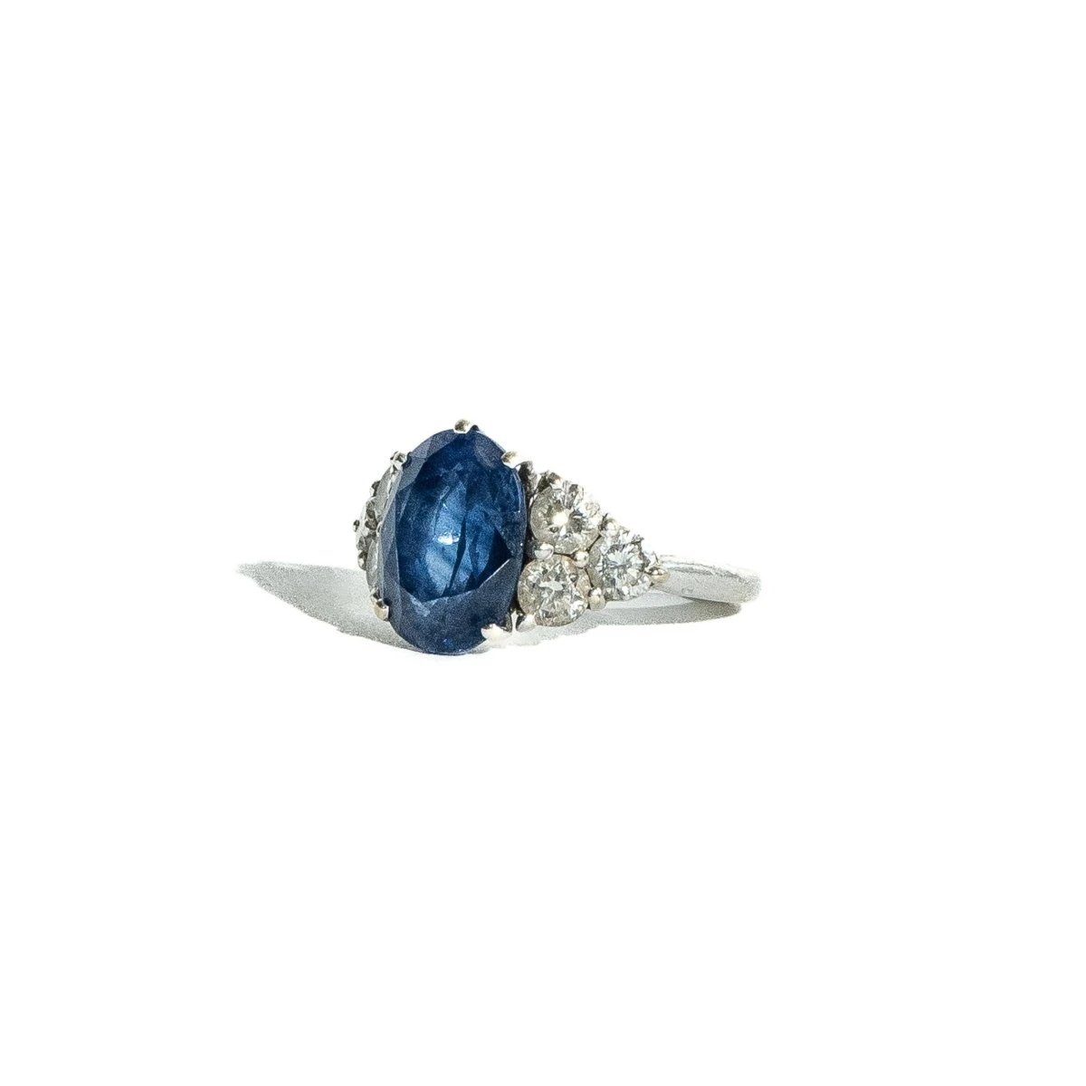 Bague trilogie en or blanc 750‰ sertie d’un saphir basaltique taille ovale de 4,28 carats, chauffée, certifié Bellerophon accompagné par 6 diamants taille brillant, qualité H/SI, pour un total de 0,90 carat.