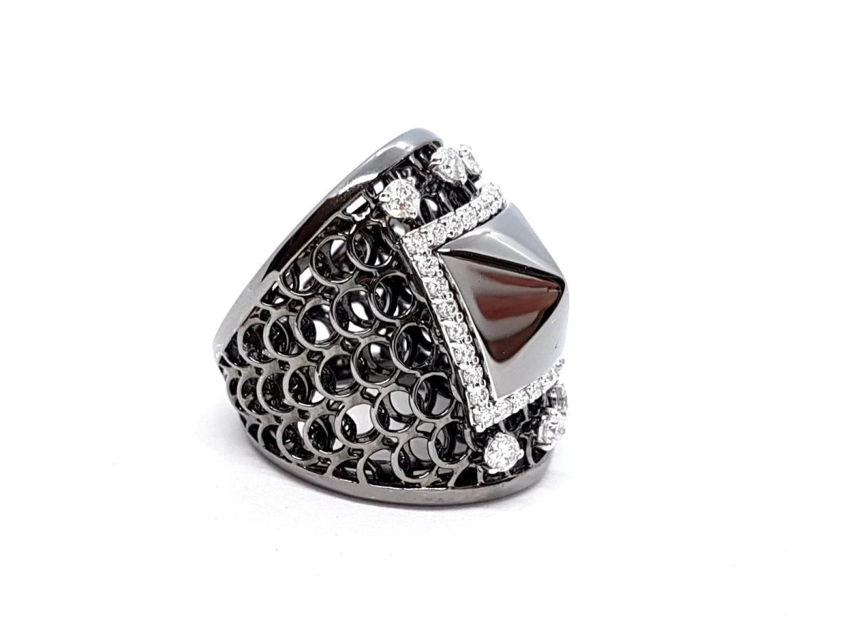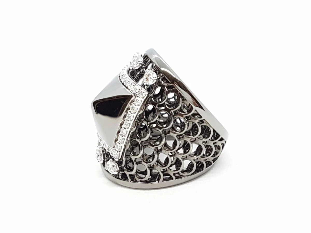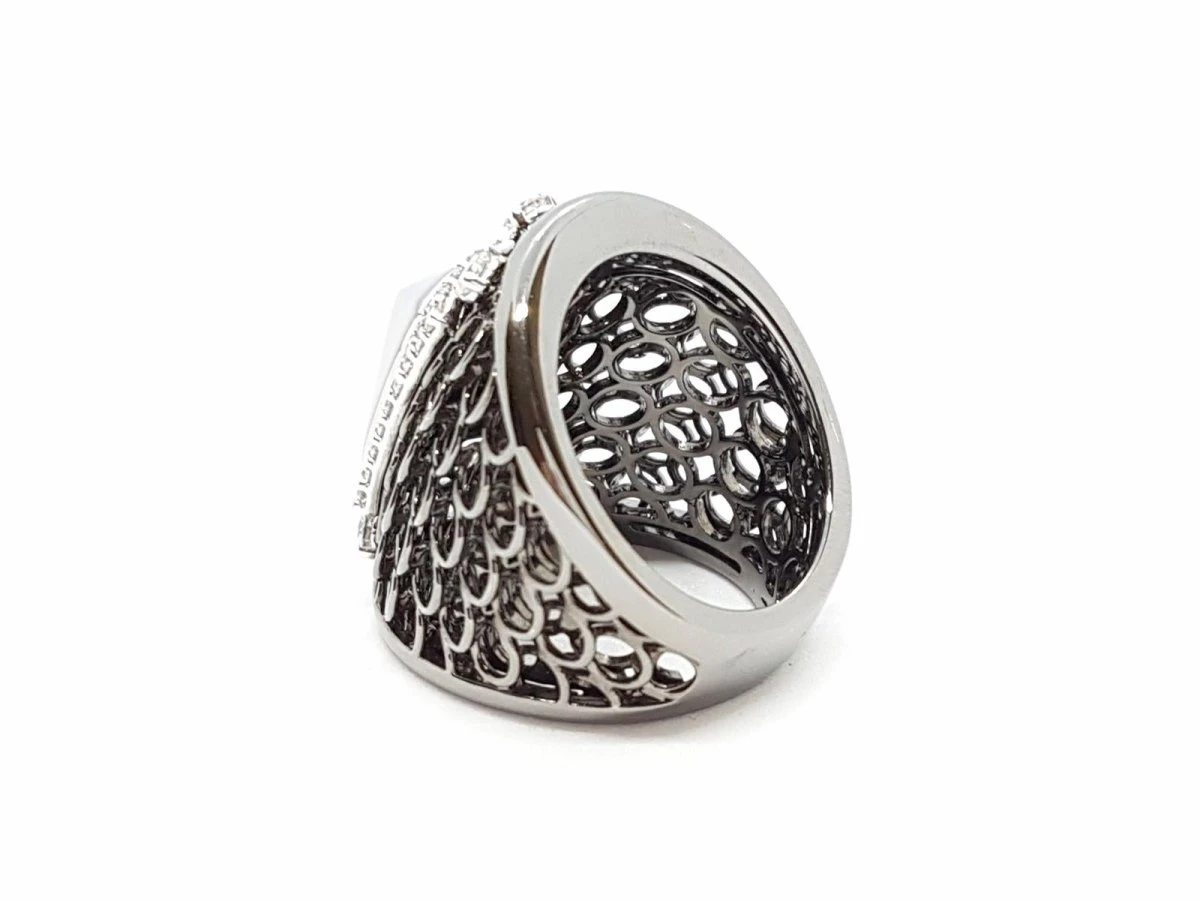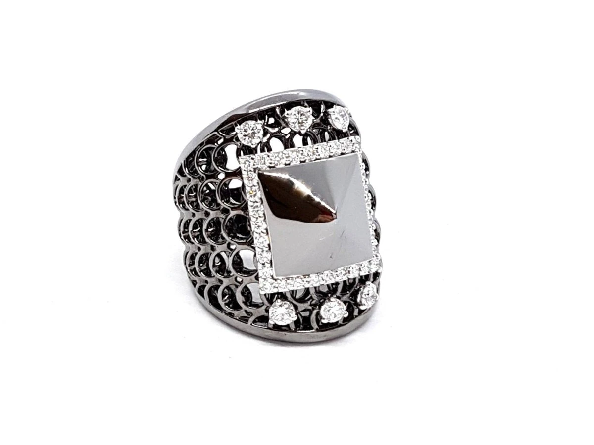 Magnifique bague en or noir 750 millièmes (18 carats). joliement travaillée. pavée de diamants taille brillant pour 0.90 ct au total. cabochon entouré de 32 diamants d’environ 0.015 ct chacun. 6 diamants d’environ 0.07 ct chacun. tour de doigt: 53. largeur sur le dessus: 2.82 cm. hauteur du cabochon: 1.2 cm. poids total: 18.97 g. poinçon tête d’aigle. état neuf