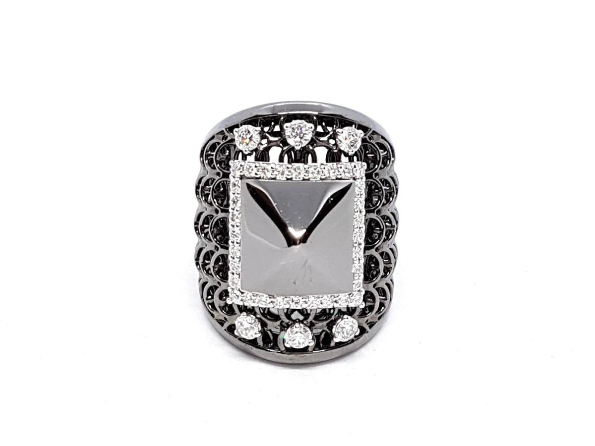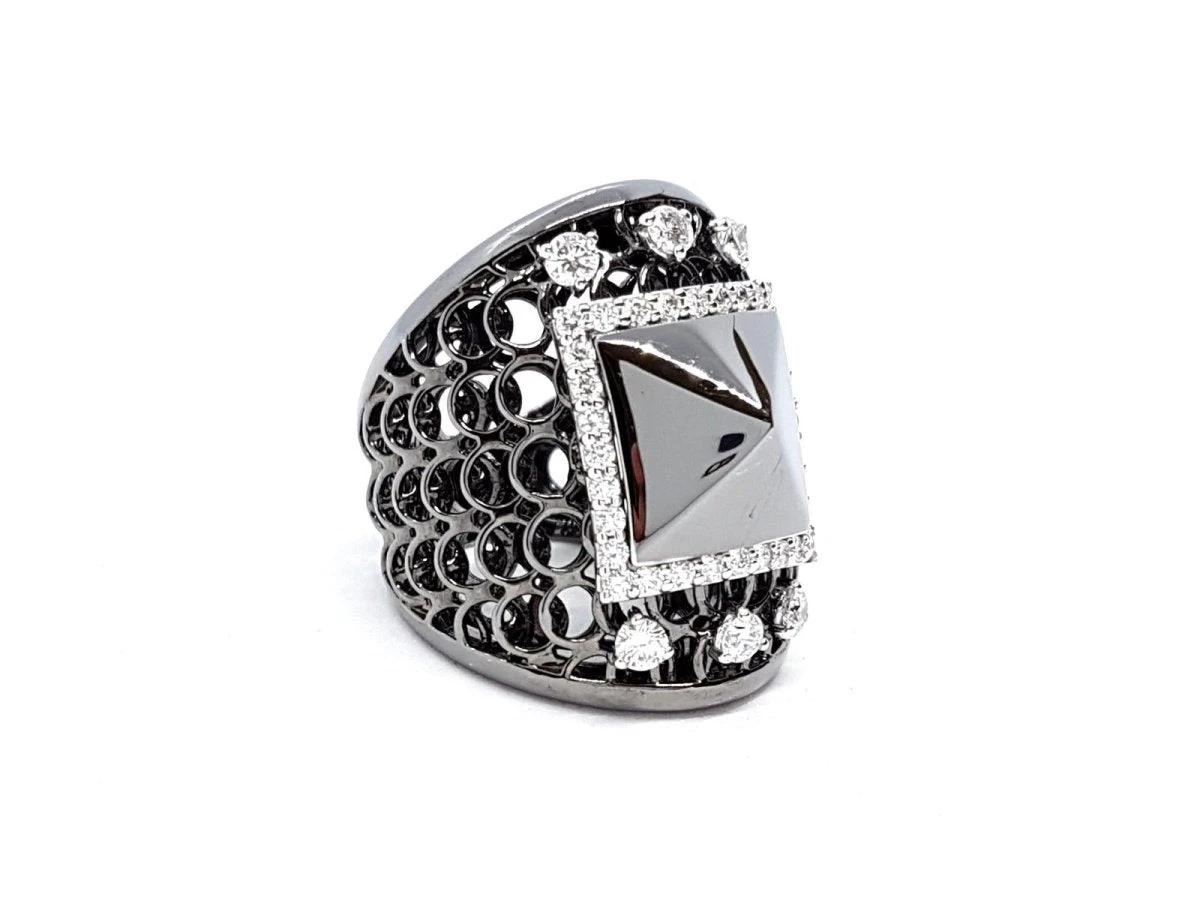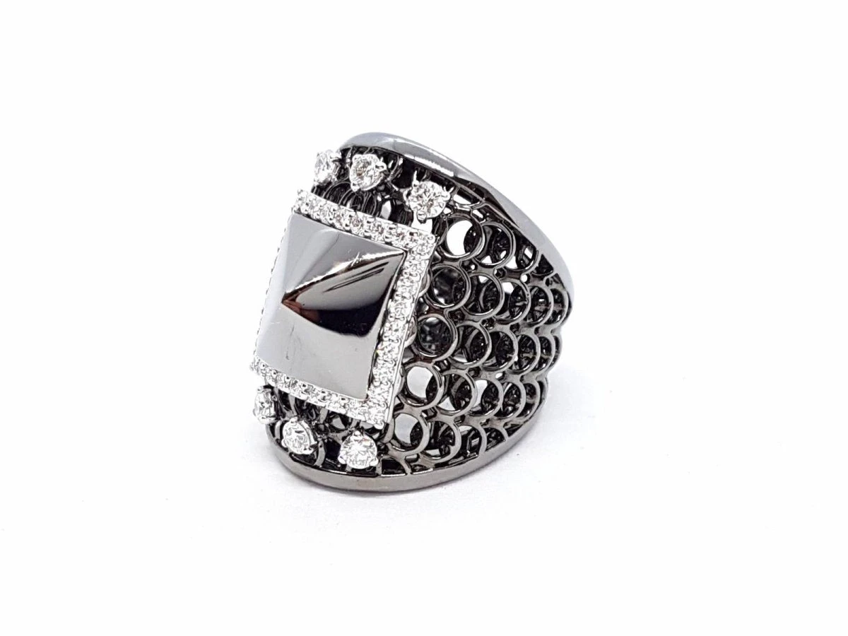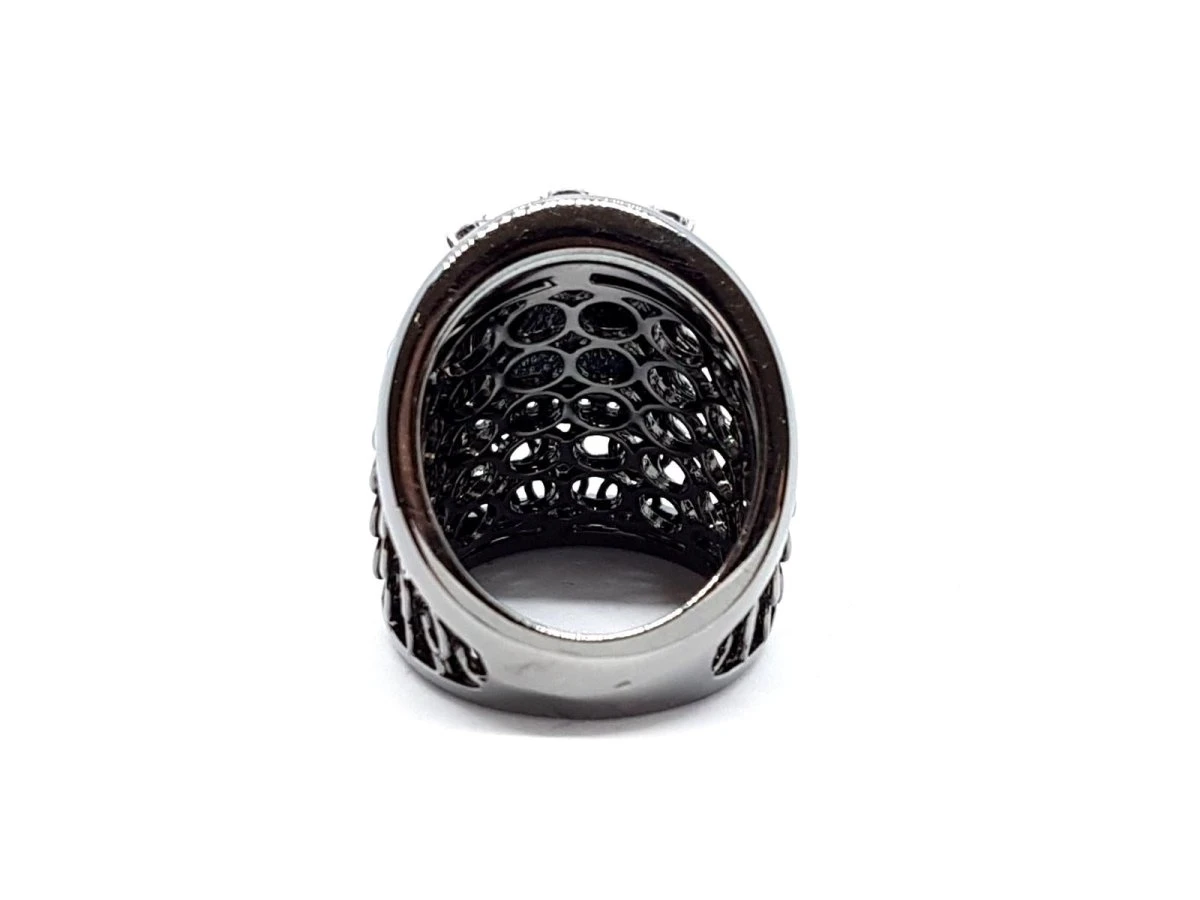 Magnifique bague en or noir 750 millièmes (18 carats). joliement travaillée. pavée de diamants taille brillant pour 0.90 ct au total. cabochon entouré de 32 diamants d’environ 0.015 ct chacun. 6 diamants d’environ 0.07 ct chacun. tour de doigt: 53. largeur sur le dessus: 2.82 cm. hauteur du cabochon: 1.2 cm. poids total: 18.97 g. poinçon tête d’aigle. état neuf