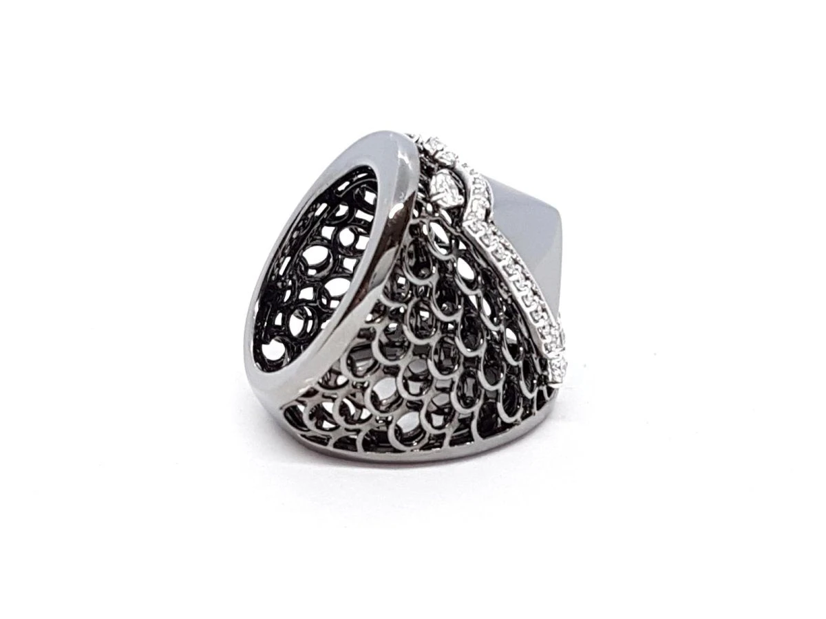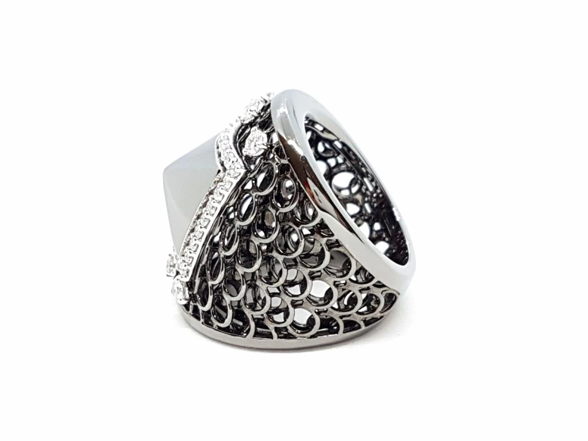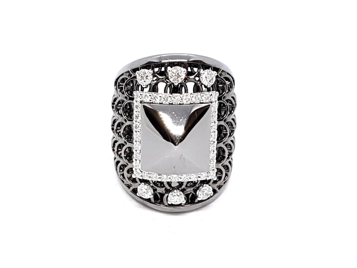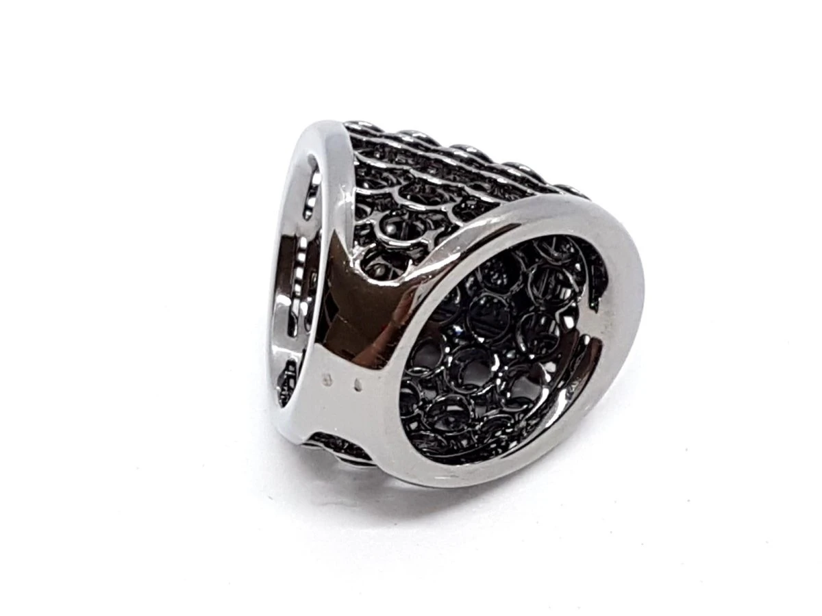 Magnifique bague en or noir 750 millièmes (18 carats). joliement travaillée. pavée de diamants taille brillant pour 0.90 ct au total. cabochon entouré de 32 diamants d’environ 0.015 ct chacun. 6 diamants d’environ 0.07 ct chacun. tour de doigt: 53. largeur sur le dessus: 2.82 cm. hauteur du cabochon: 1.2 cm. poids total: 18.97 g. poinçon tête d’aigle. état neuf