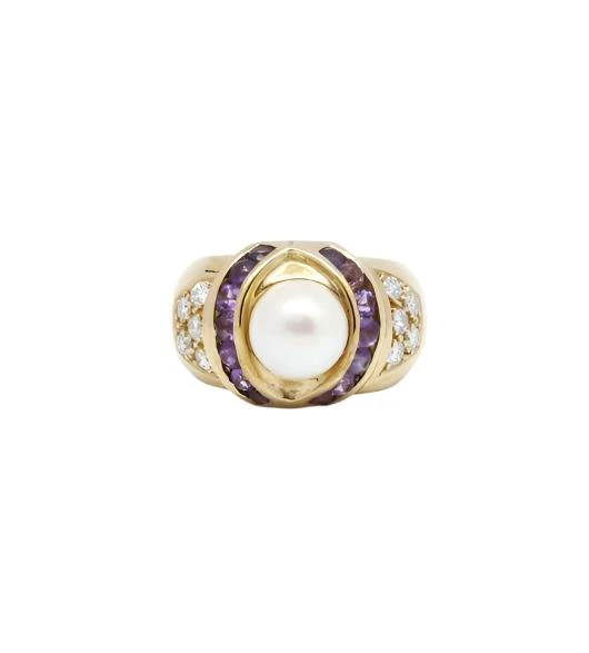 Bague chevalière en or jaune 750‰, sertie d’une perle de culture au centre, entourée de 14 petites améthystes épaulées de chaque coté d’un pavage de petits diamants.