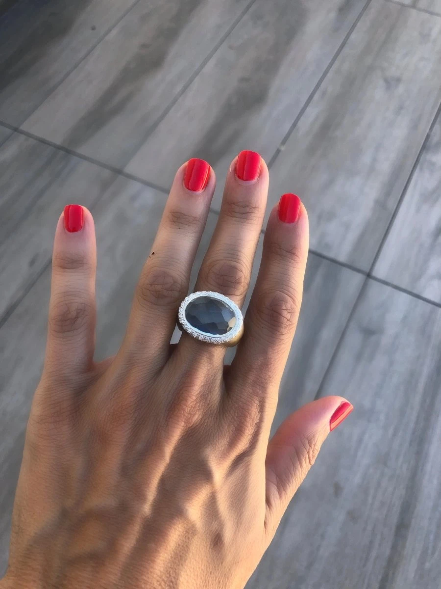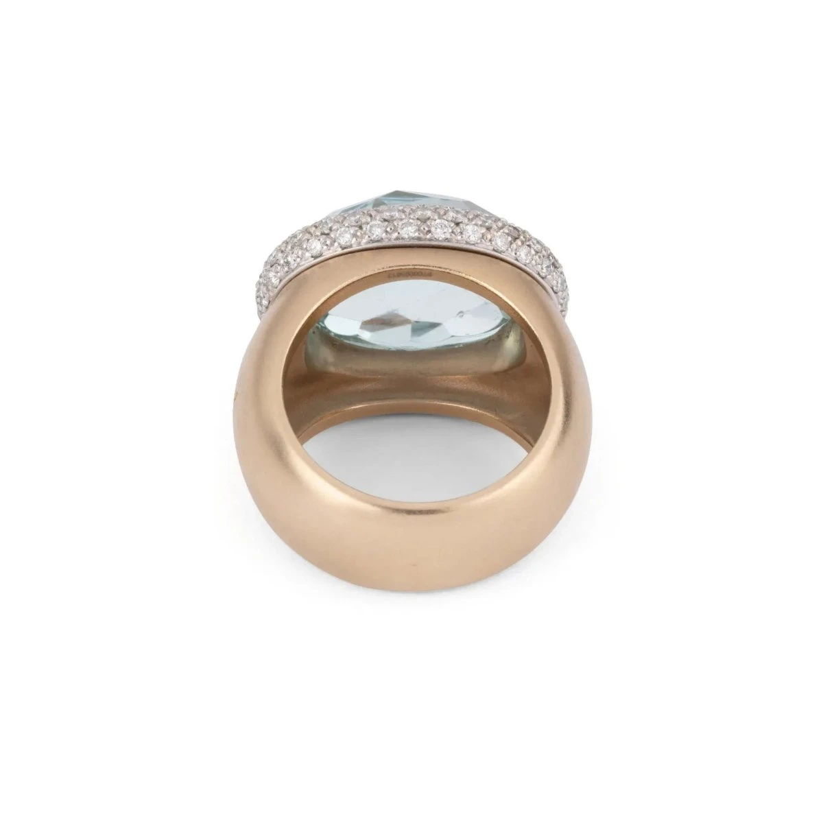 Bague or rose sablé signée de la maison italienne Pomellato modèle iceberg ornée d’un cabochon de Aigue marine ovale facettée rehaussée d’une belle bordure bombée en or blanc entièrement pavée de 2 rangs de diamants de taille brillant.