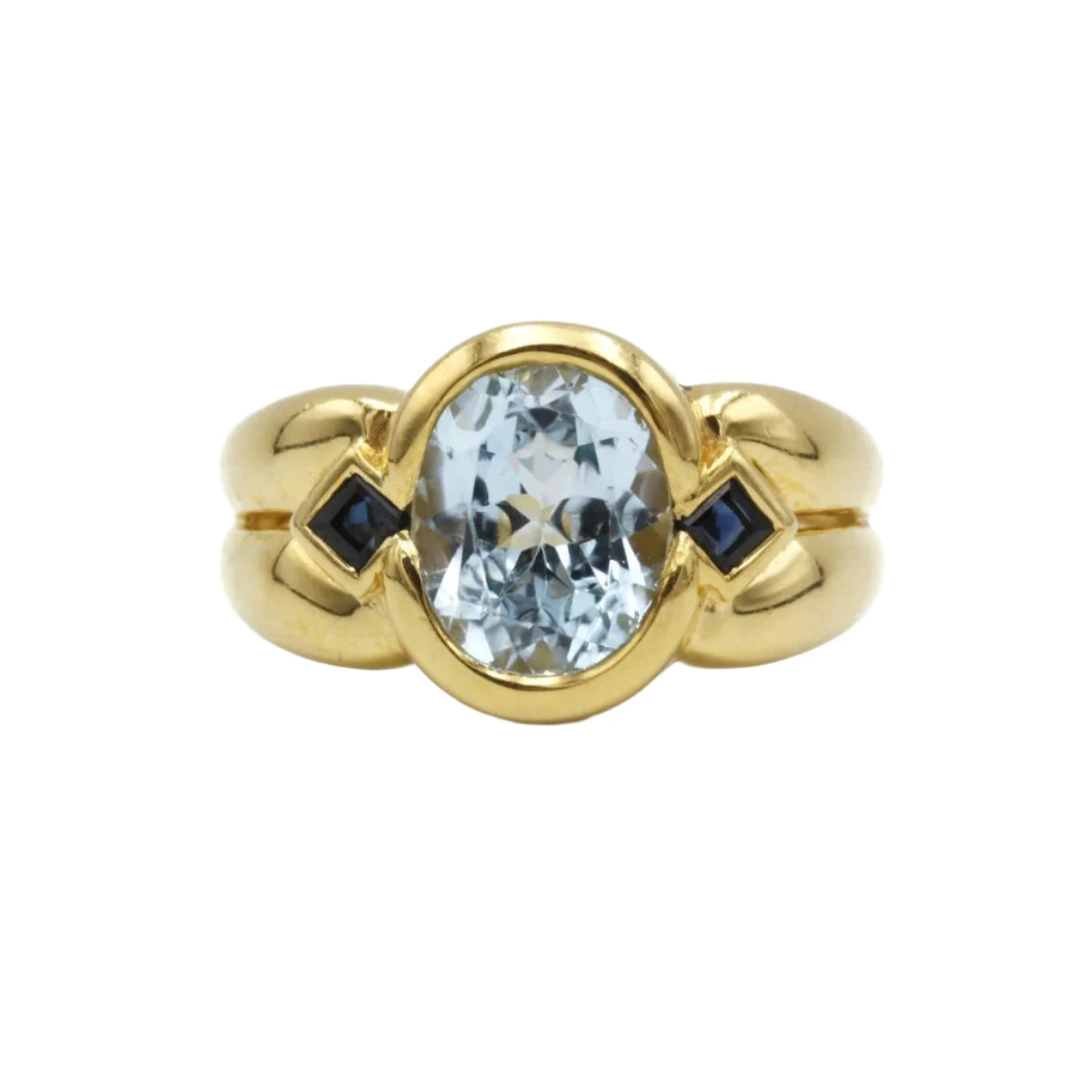 Bague godronnée des années 70-80, en or jaune 750‰, sertie d’une topaze ovale de 3,50 carat environ, épaulée par 2 saphirs carrés.
