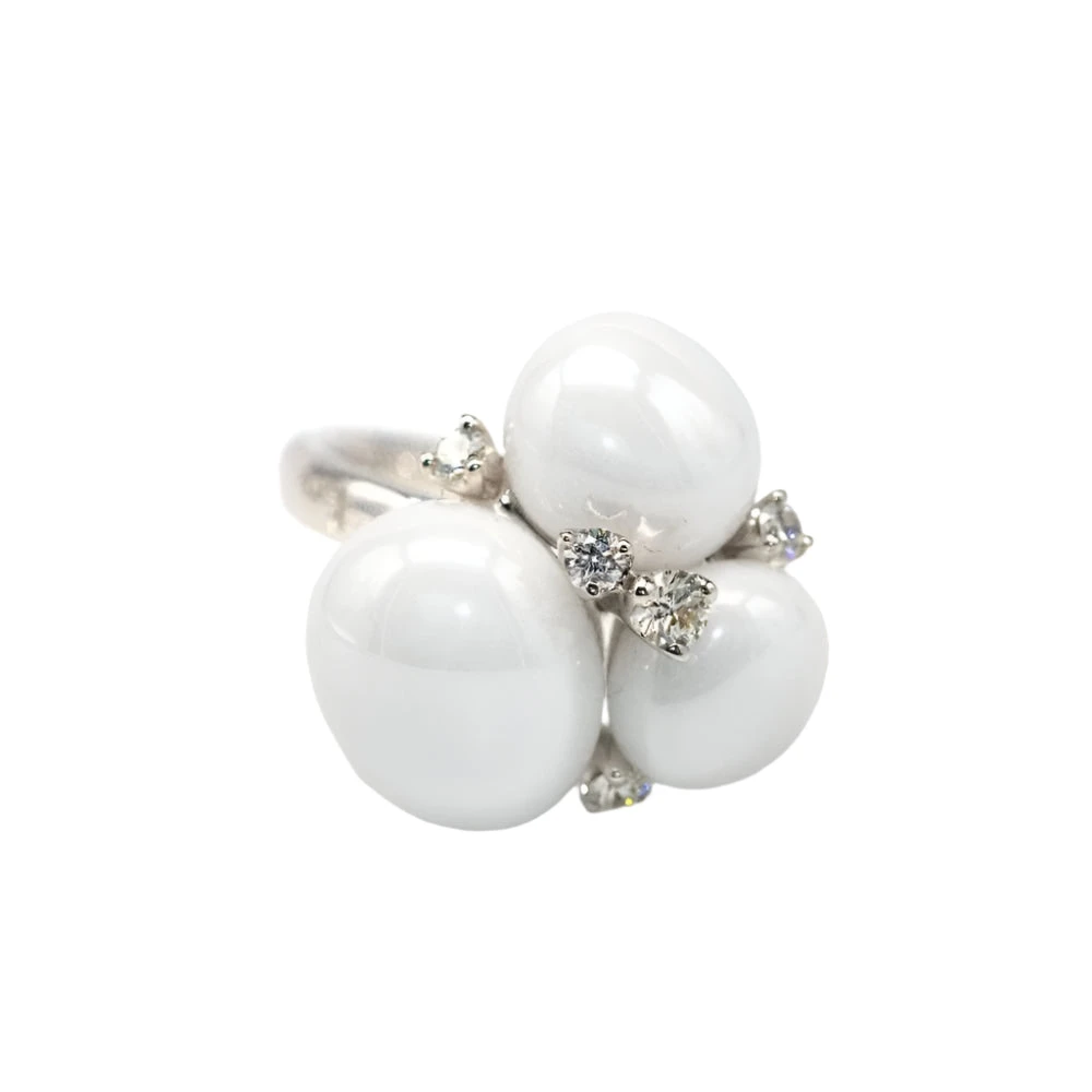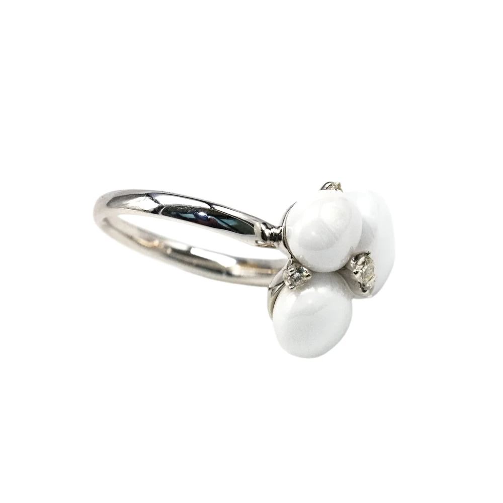 Bague POMELLATO en or blanc et diamants. 5 diamants en taille brillant avec un poids total de 0,15 carat de qualité G/VS, 3 céramique blanche. Cette bague a son écrin d’origine et le Certificat de garantie de la marque.