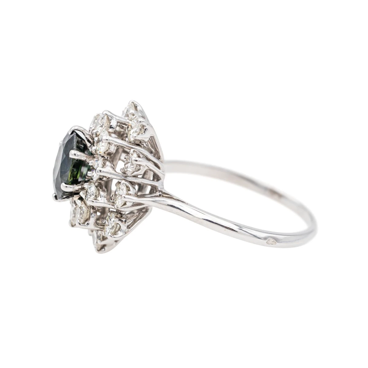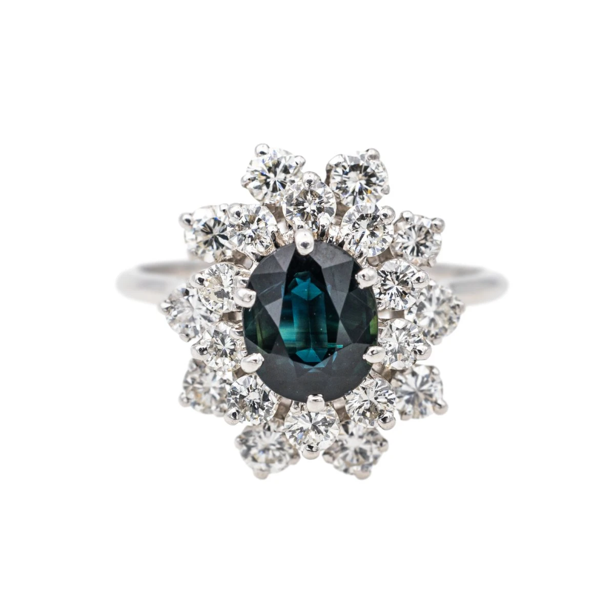 Bague Pompadour en or blanc 750 millièmes (18 carats). sertie d’un saphir et de diamants. un saphir taille ovale. d’un poids total d’environ 1.30 cts. entouré de 20 diamants taille brillant. d’un poids total d’environ 1.40 cts. largeur sur le dessus : 1.60 cm. tour de doigt : 54. poids total : 4.83 g. poinçon tête d’aigle. excellent état