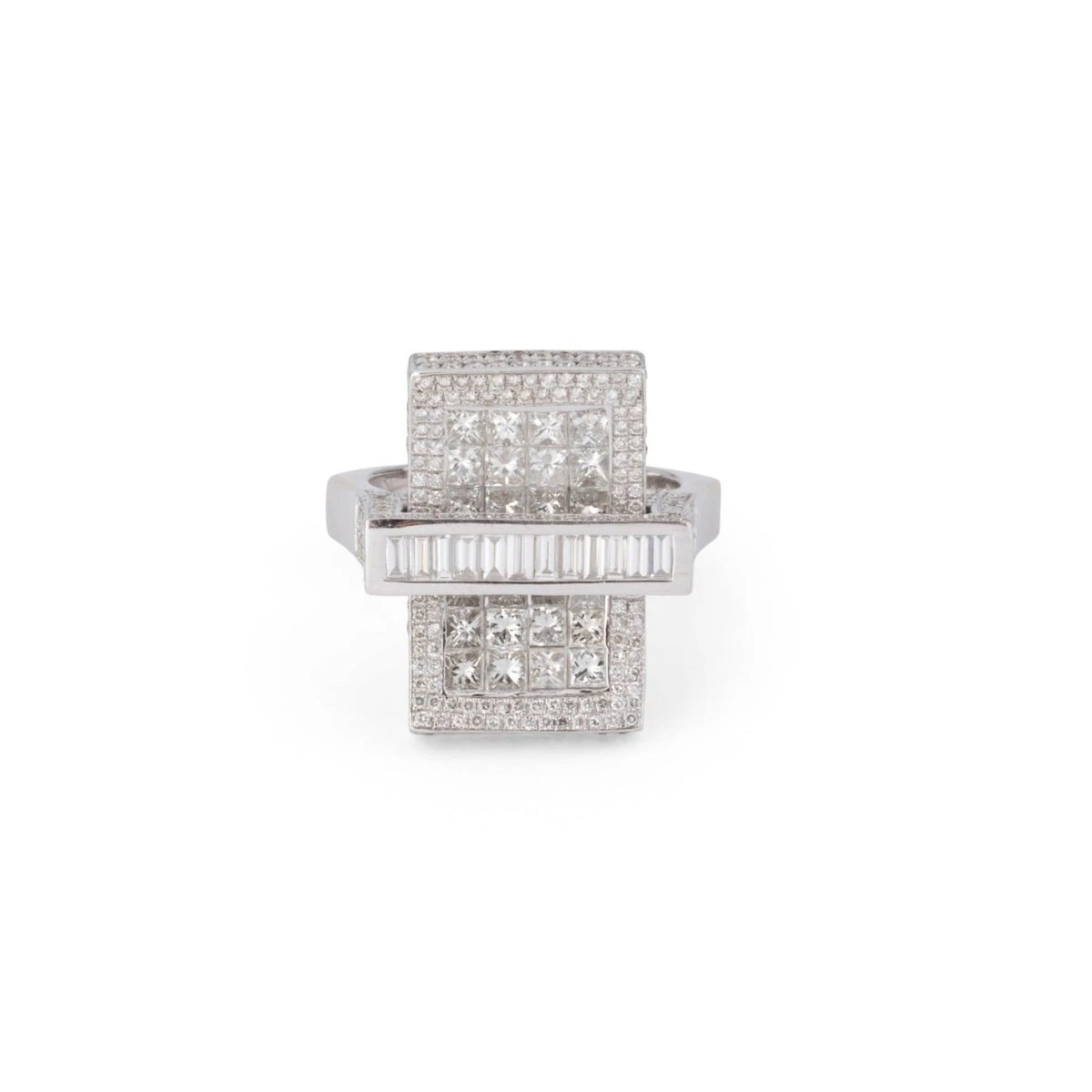 Bague Rectangulaire en or blanc 18 carats composée de deux motifs géométriques superposés. Le motif central est serti de 28 Diamants taille brillant ainsi que de 12 Diamants baguette. Monture rehaussée d’un pavage de Diamants sur toute ses faces.